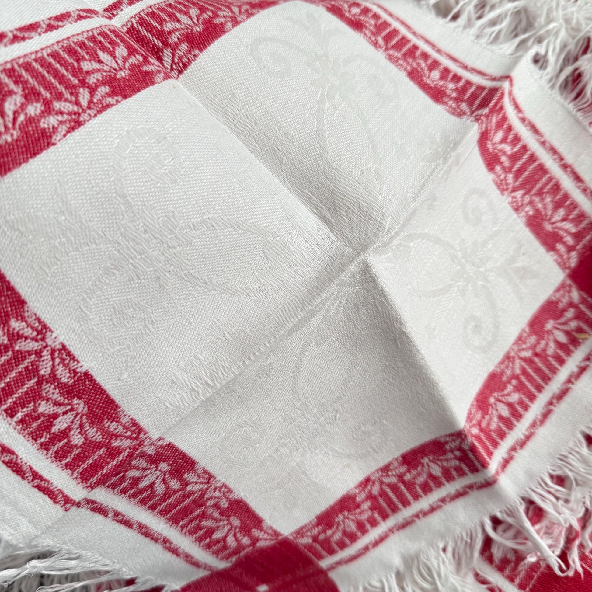 A pretty floral pattern in the centre and on the raspberry border.