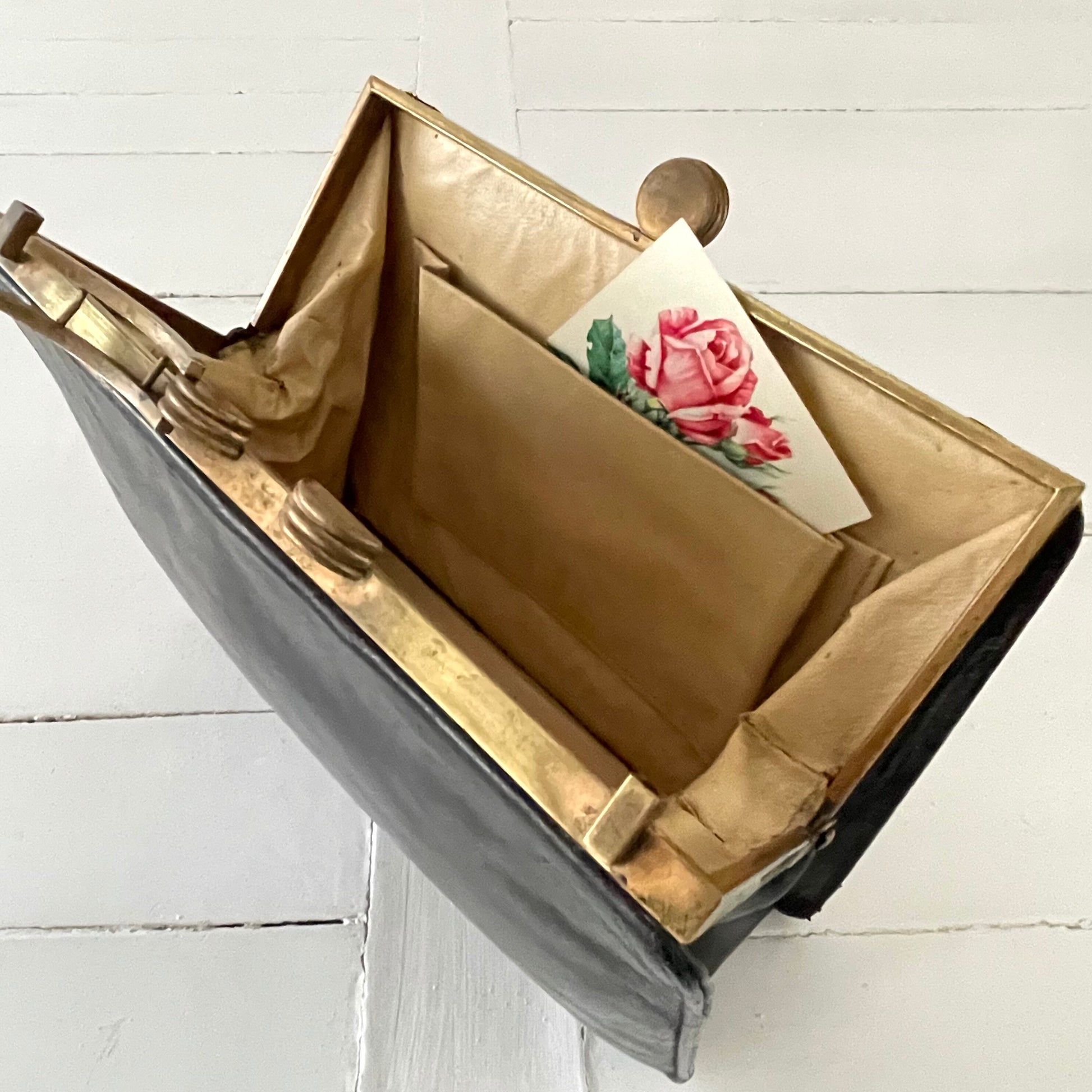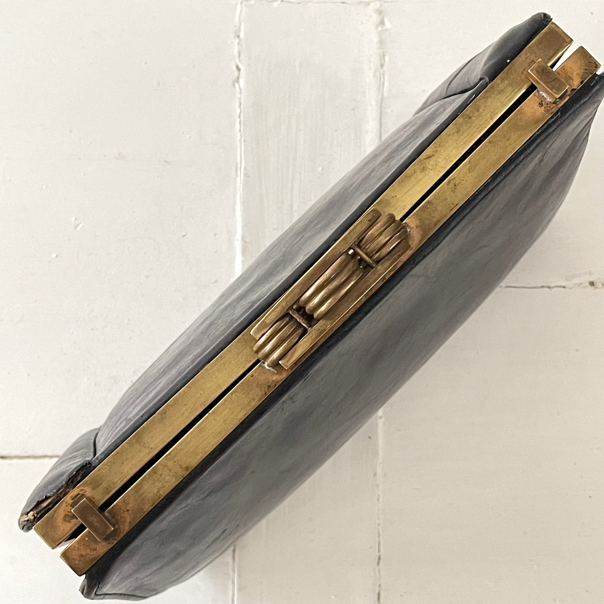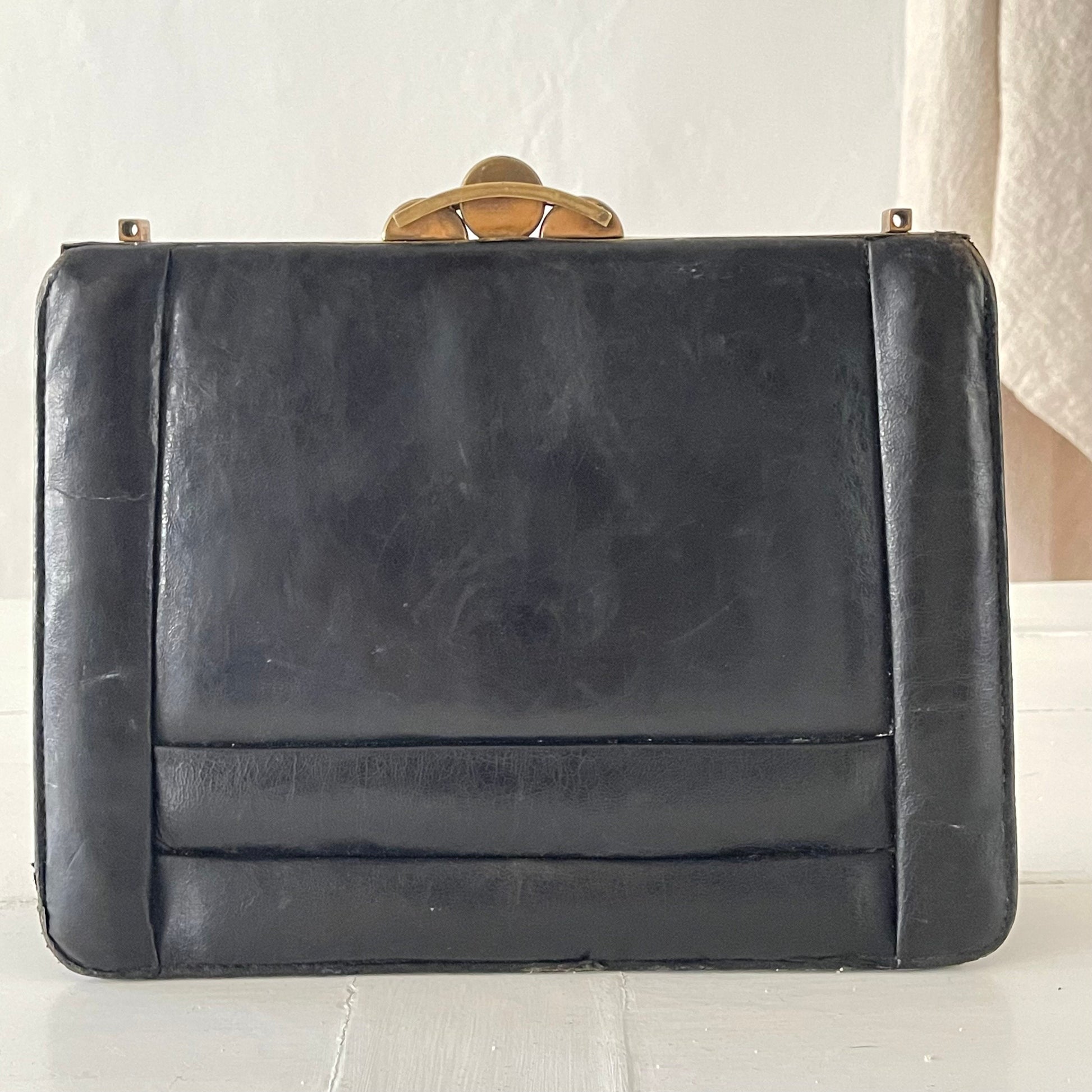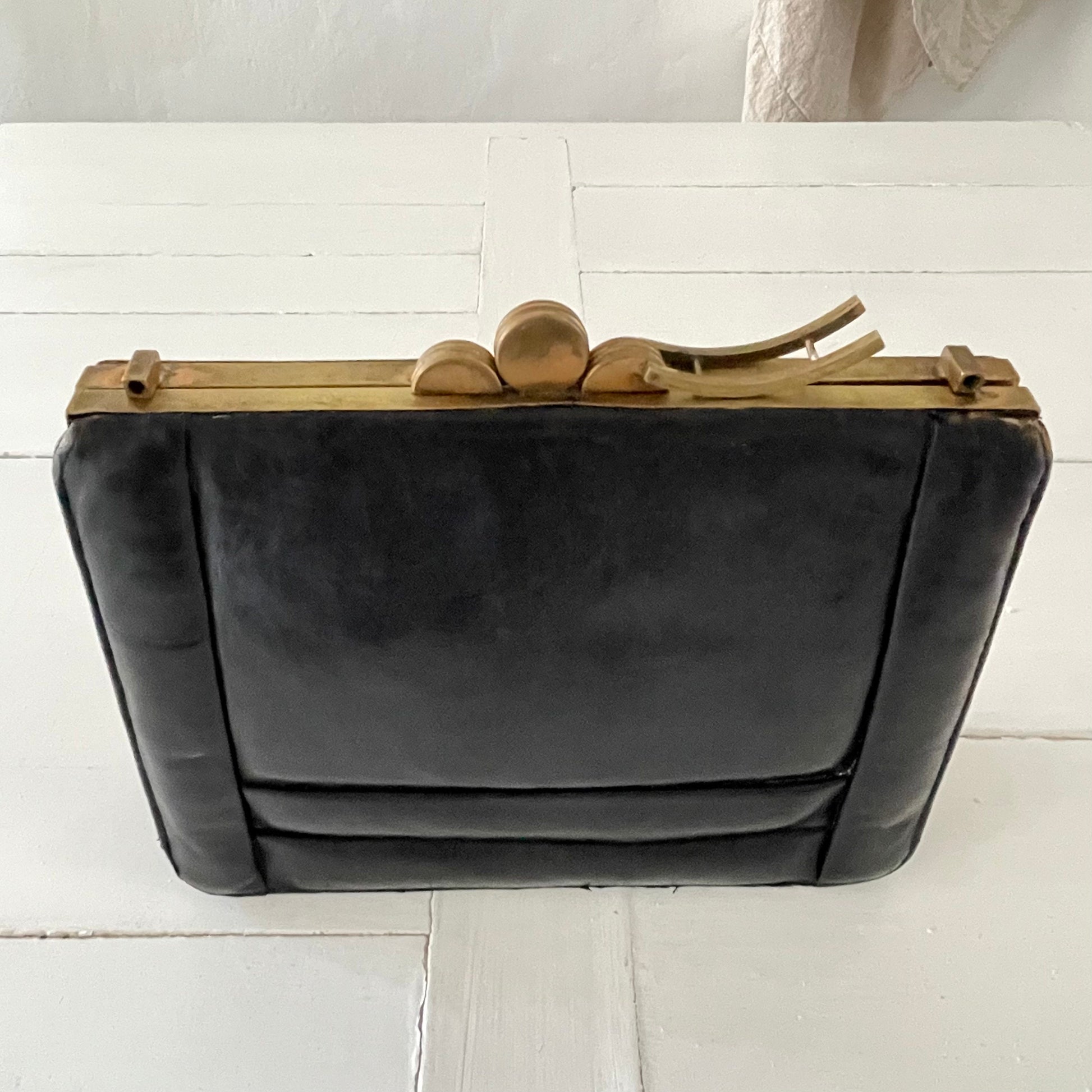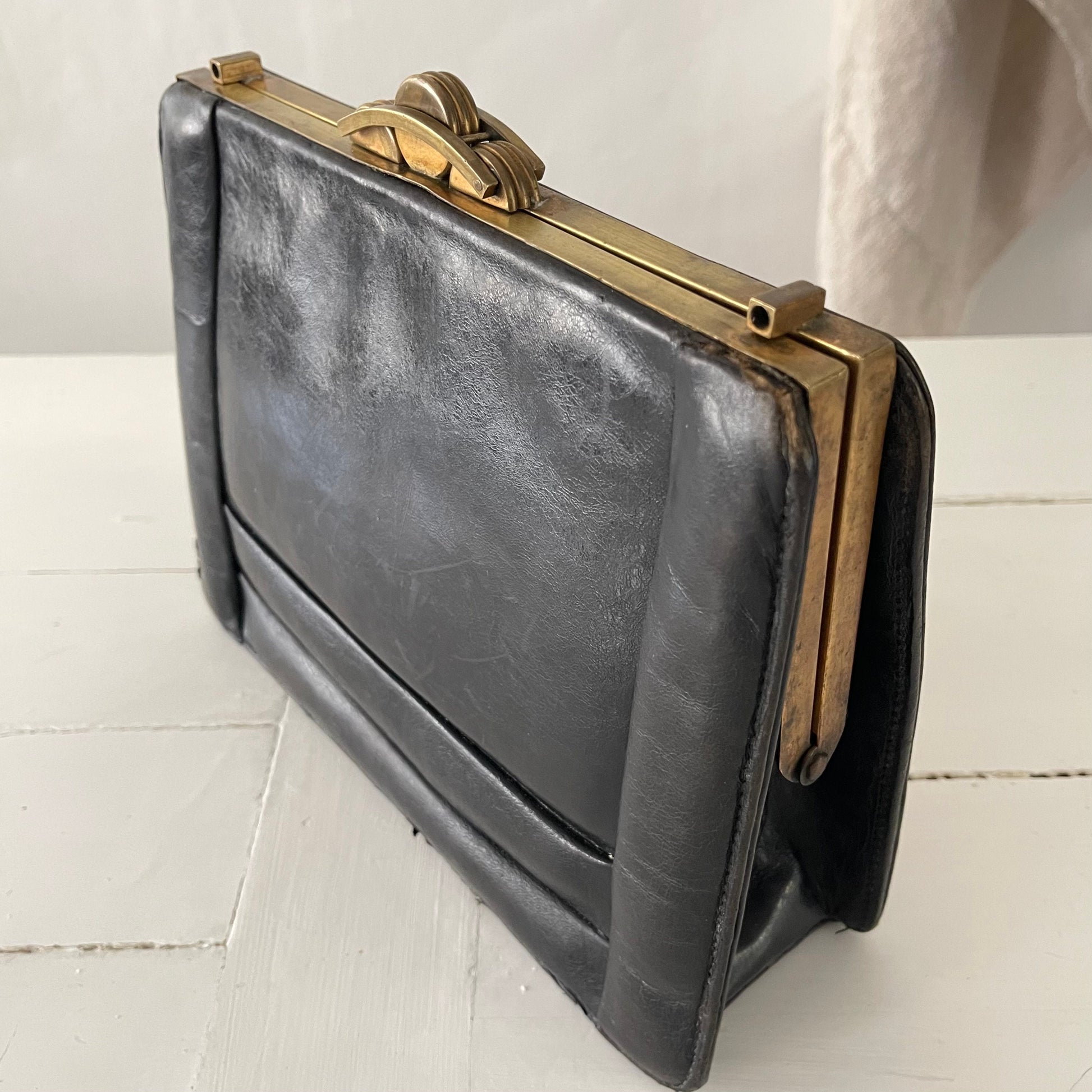 1920's French antique black leather handbag / clutch bag.. very fine! A big space and 3 slip pockets, perfect for carrying the essentials, a lovely Deco style brass fastener. Beautiful and practical to use or simply as decor. A small hole at each end of the brass top where a handle / chain could be attached if needed.