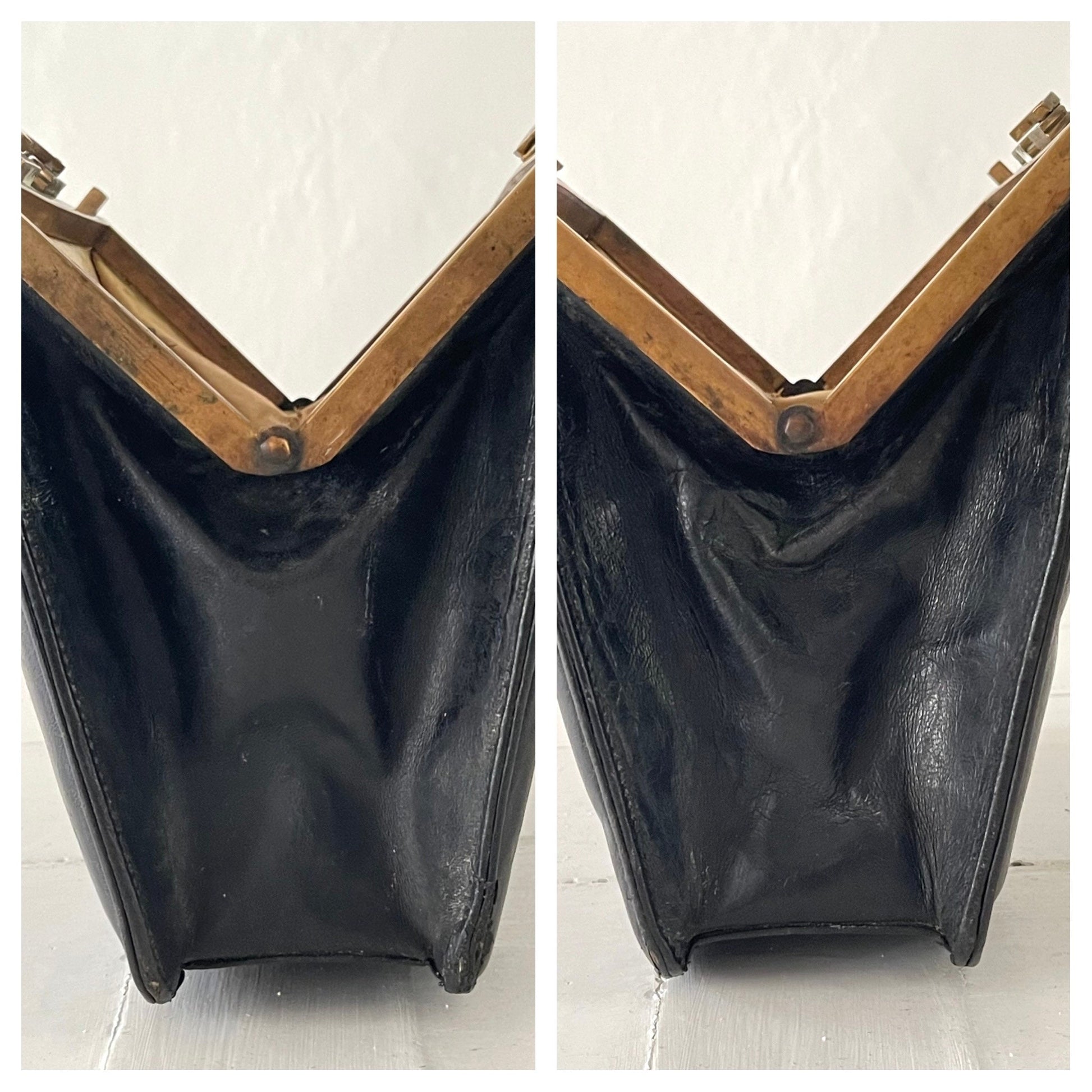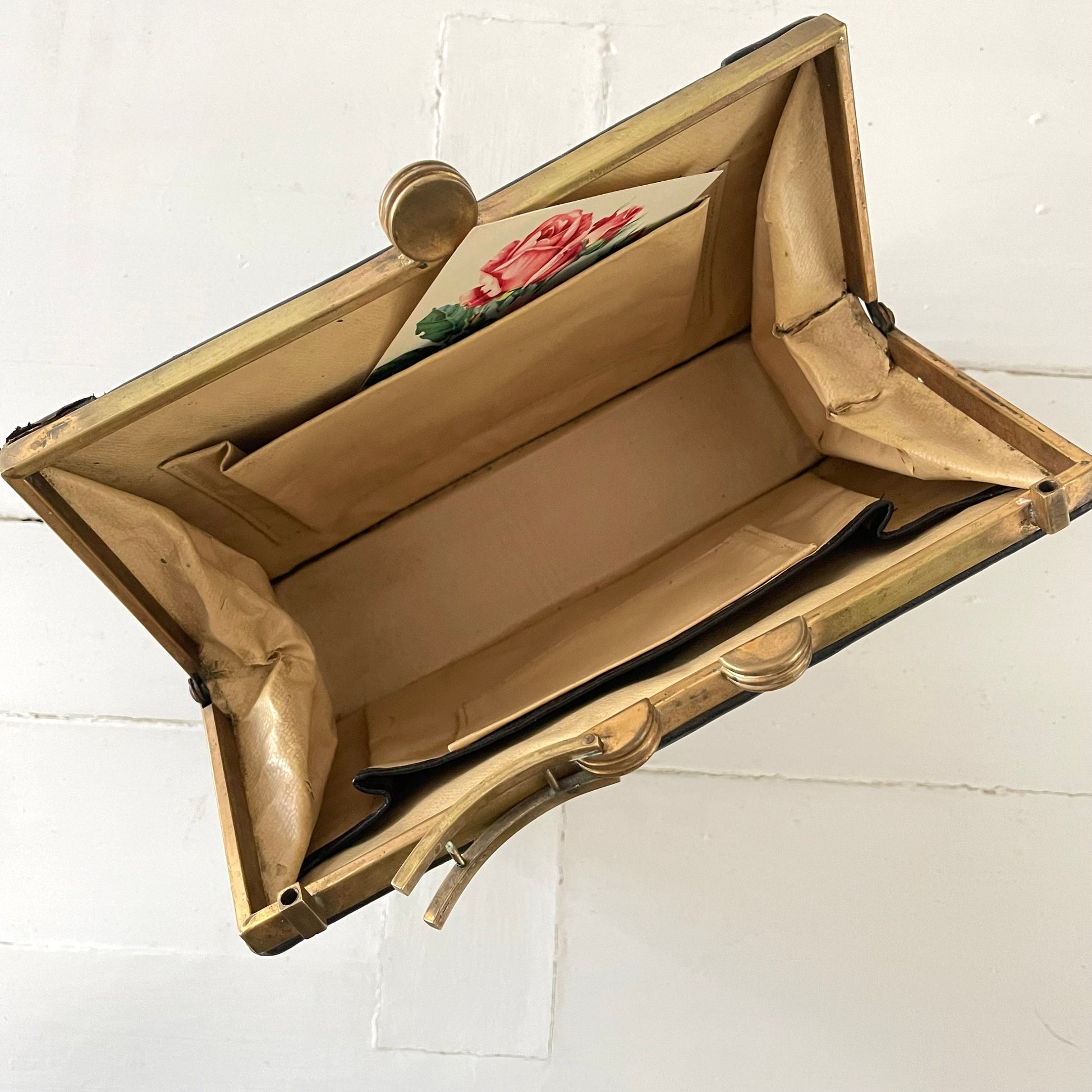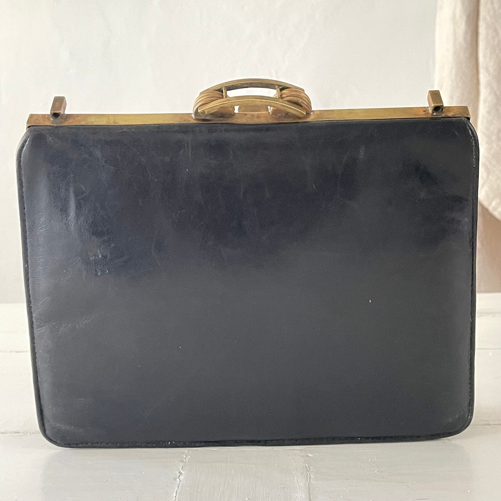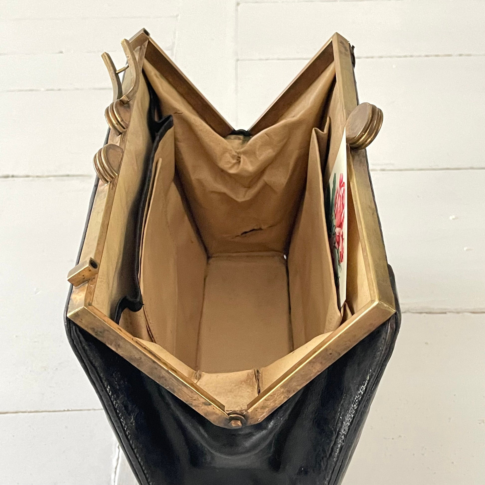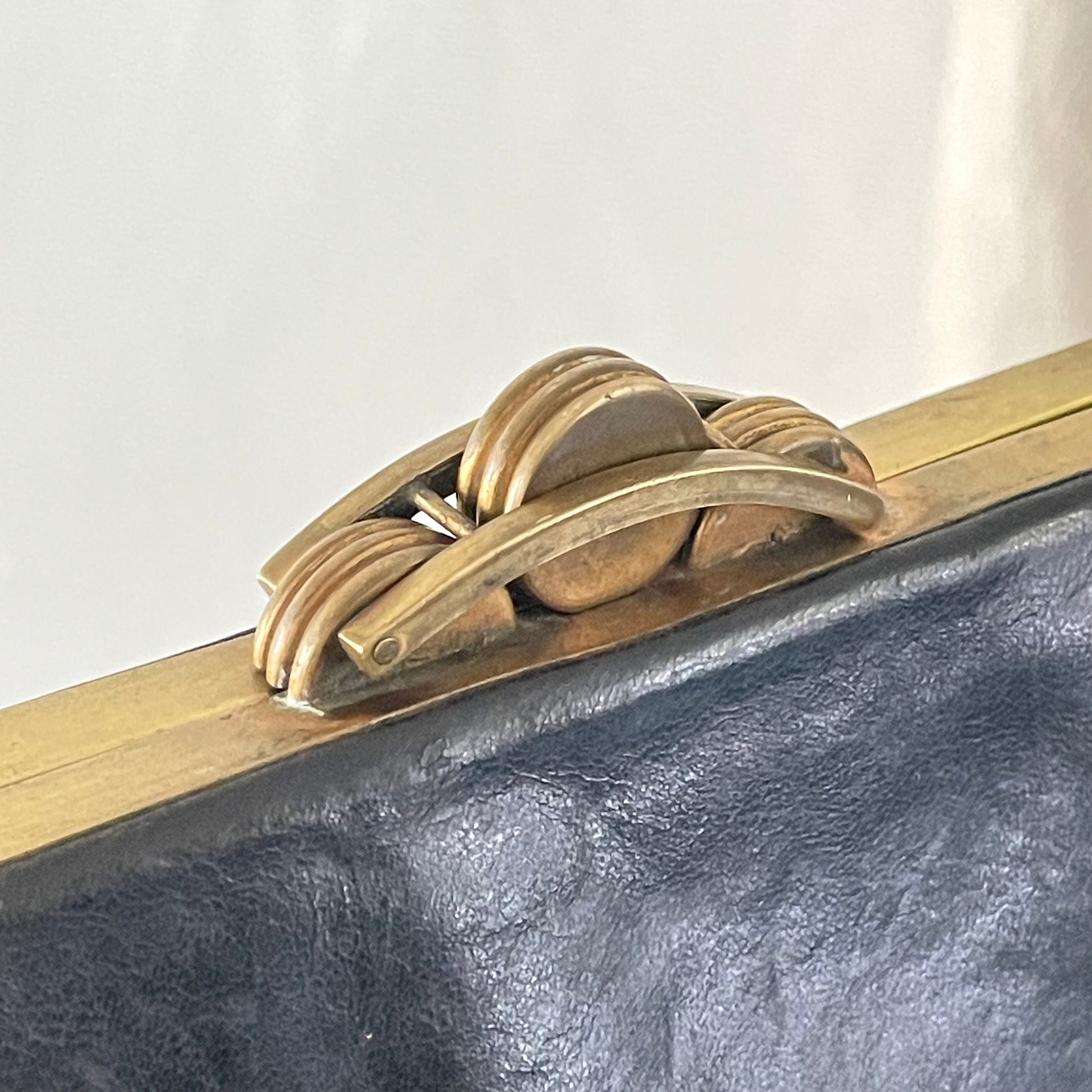 1920's French antique black leather handbag / clutch bag.. very fine! A big space and 3 slip pockets, perfect for carrying the essentials, a lovely Deco style brass fastener. Beautiful and practical to use or simply as decor. A small hole at each end of the brass top where a handle / chain could be attached if needed.