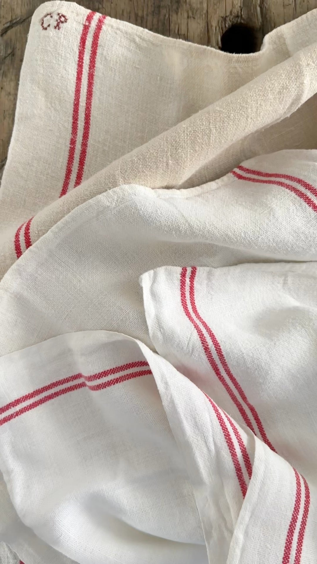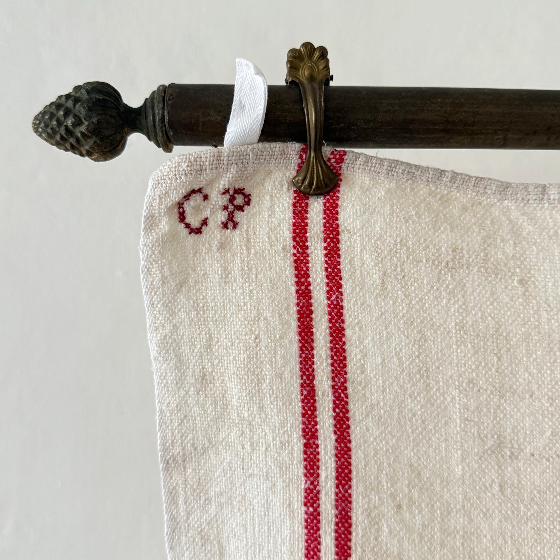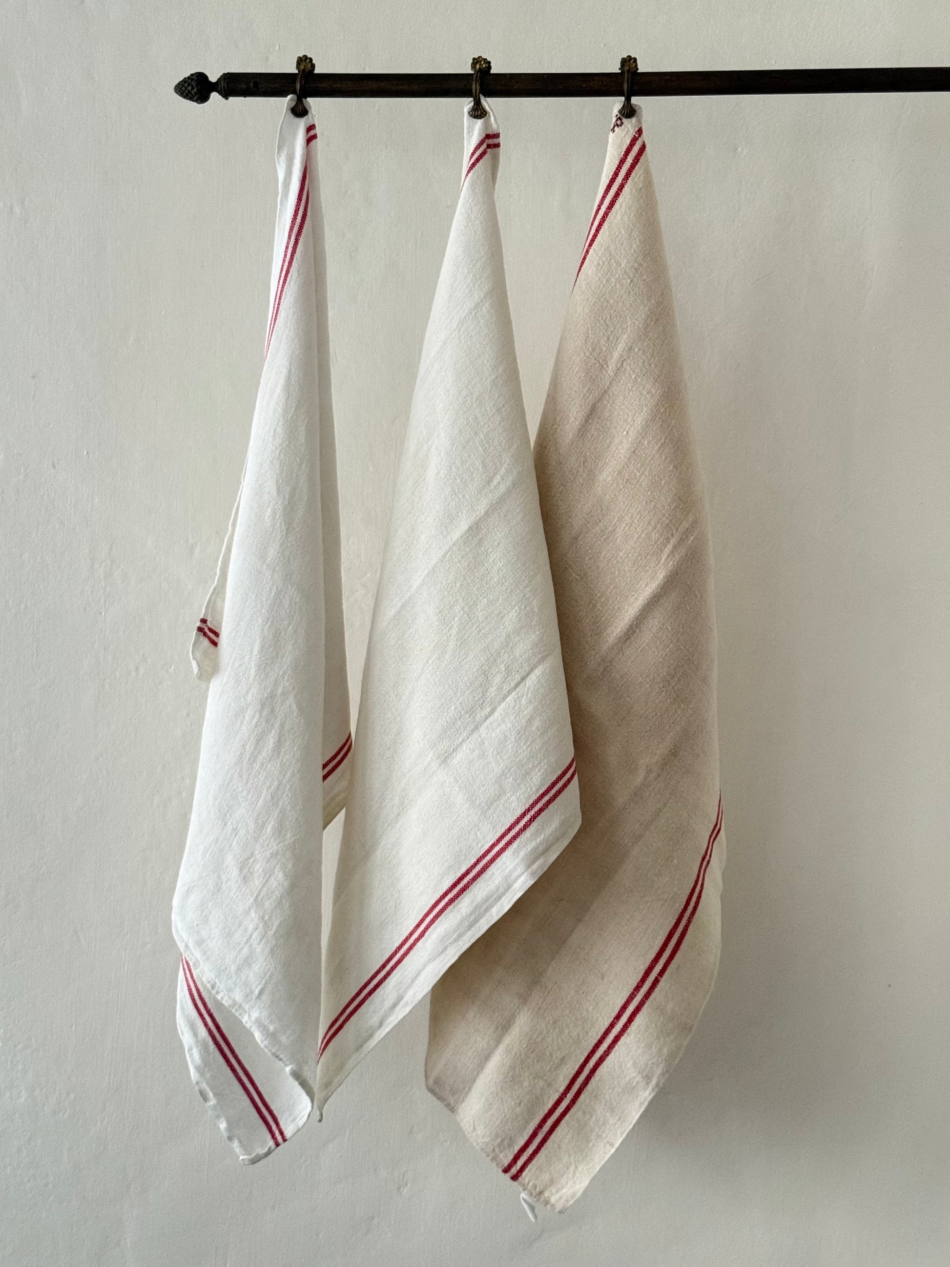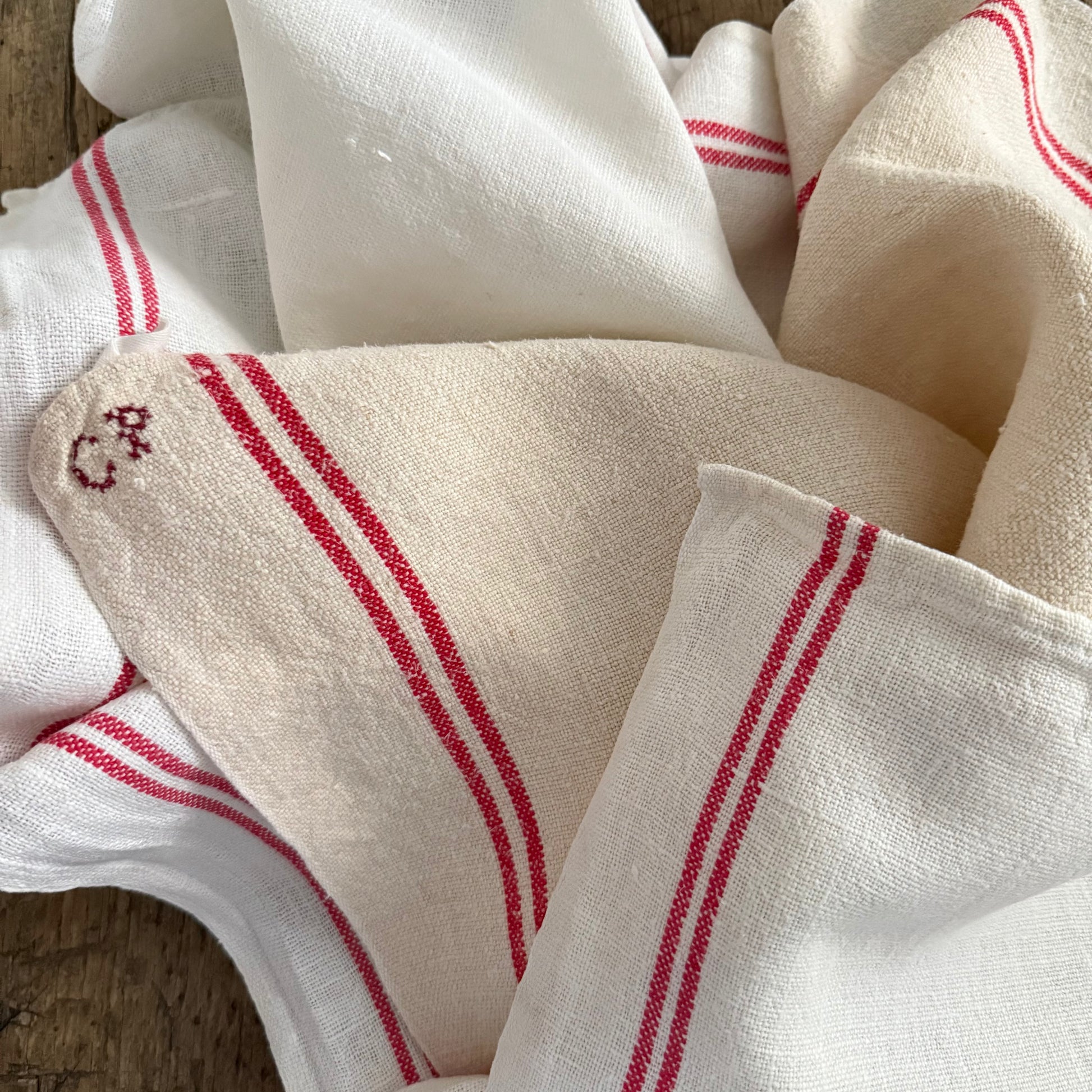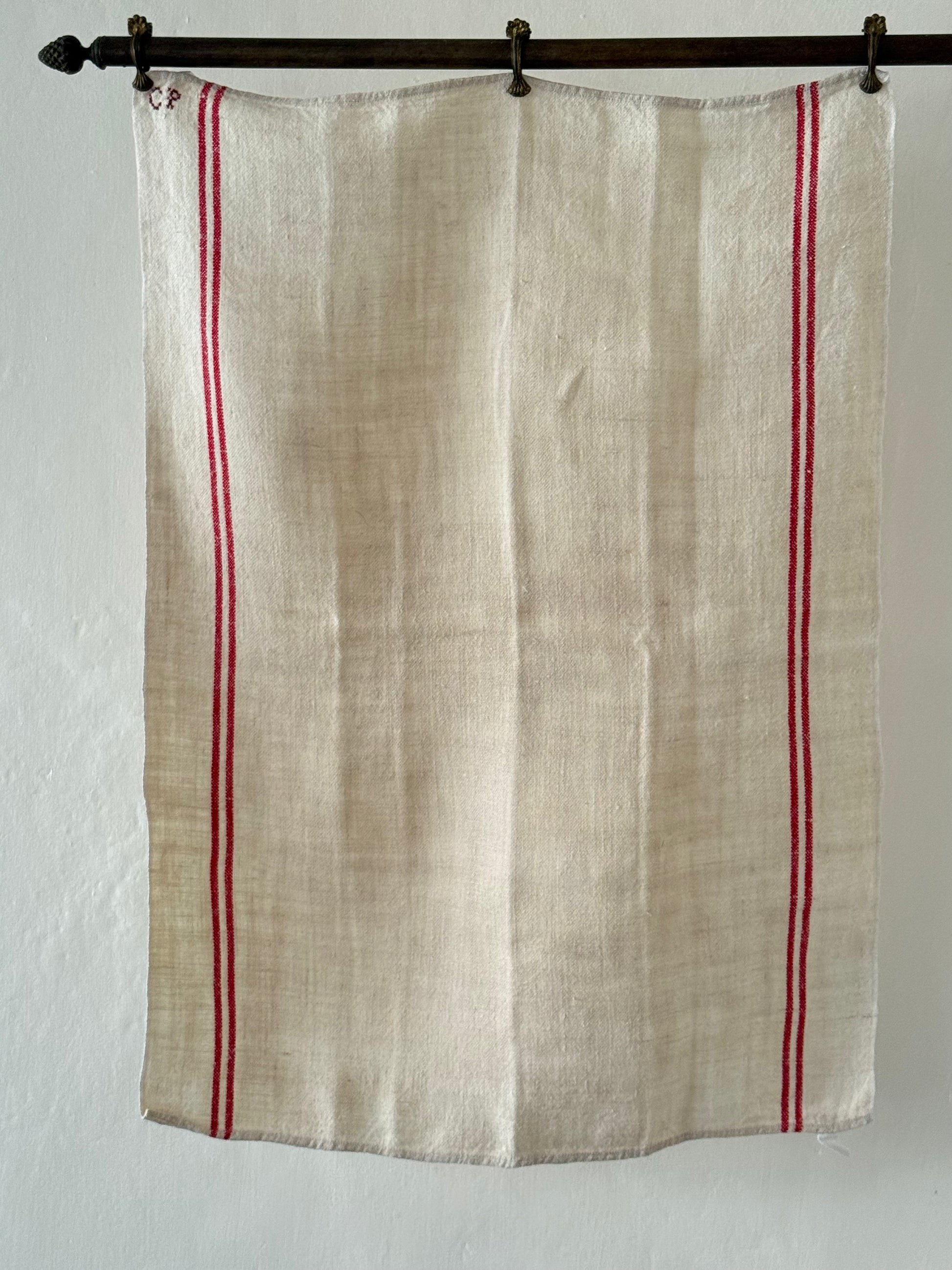 Set of 3 French vintage hemp torchons, two raspberry red stripes down each side, a CP monogram and loop to hang on the one with the natural hue. This is a different colour because it has never been used!