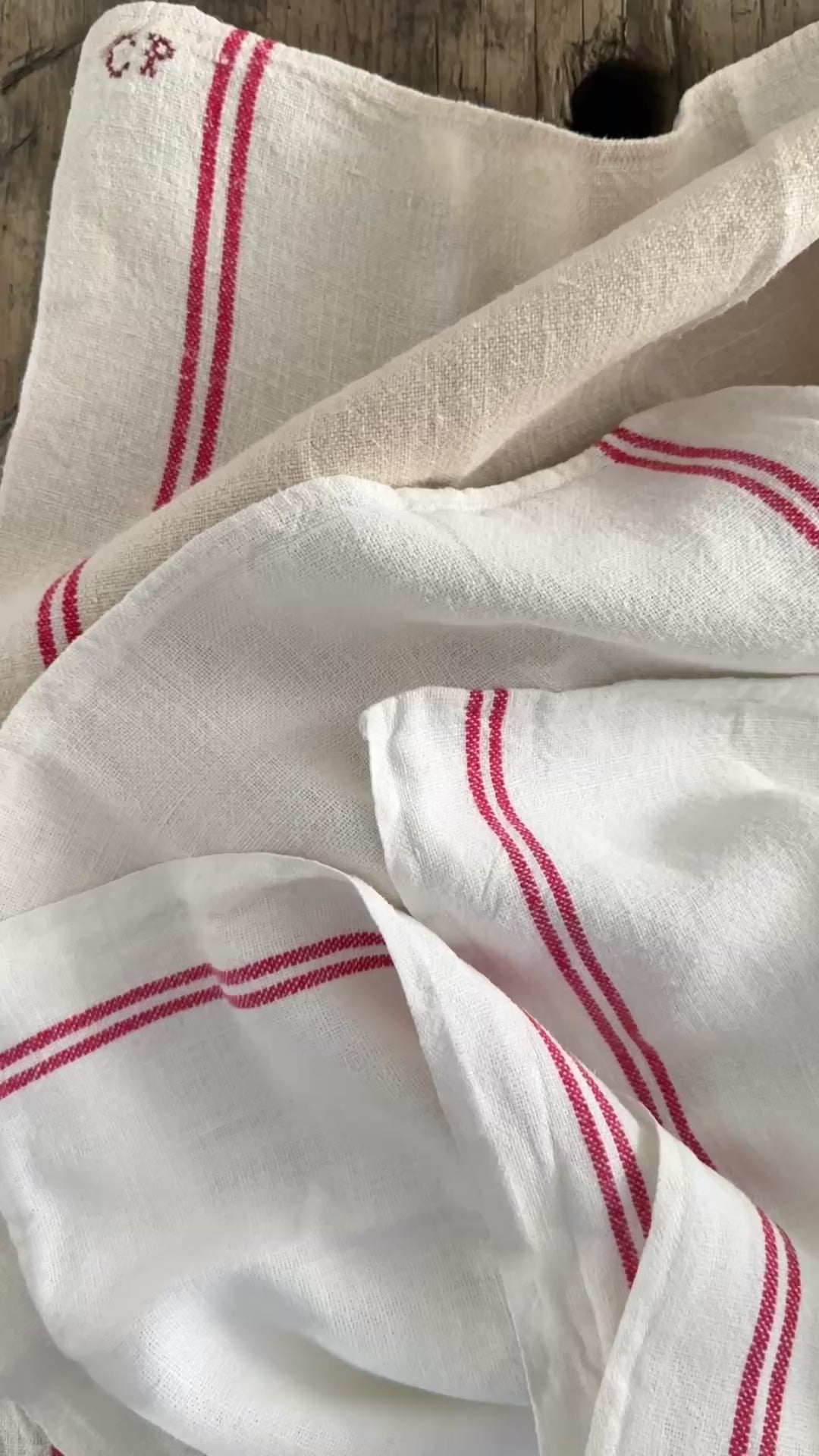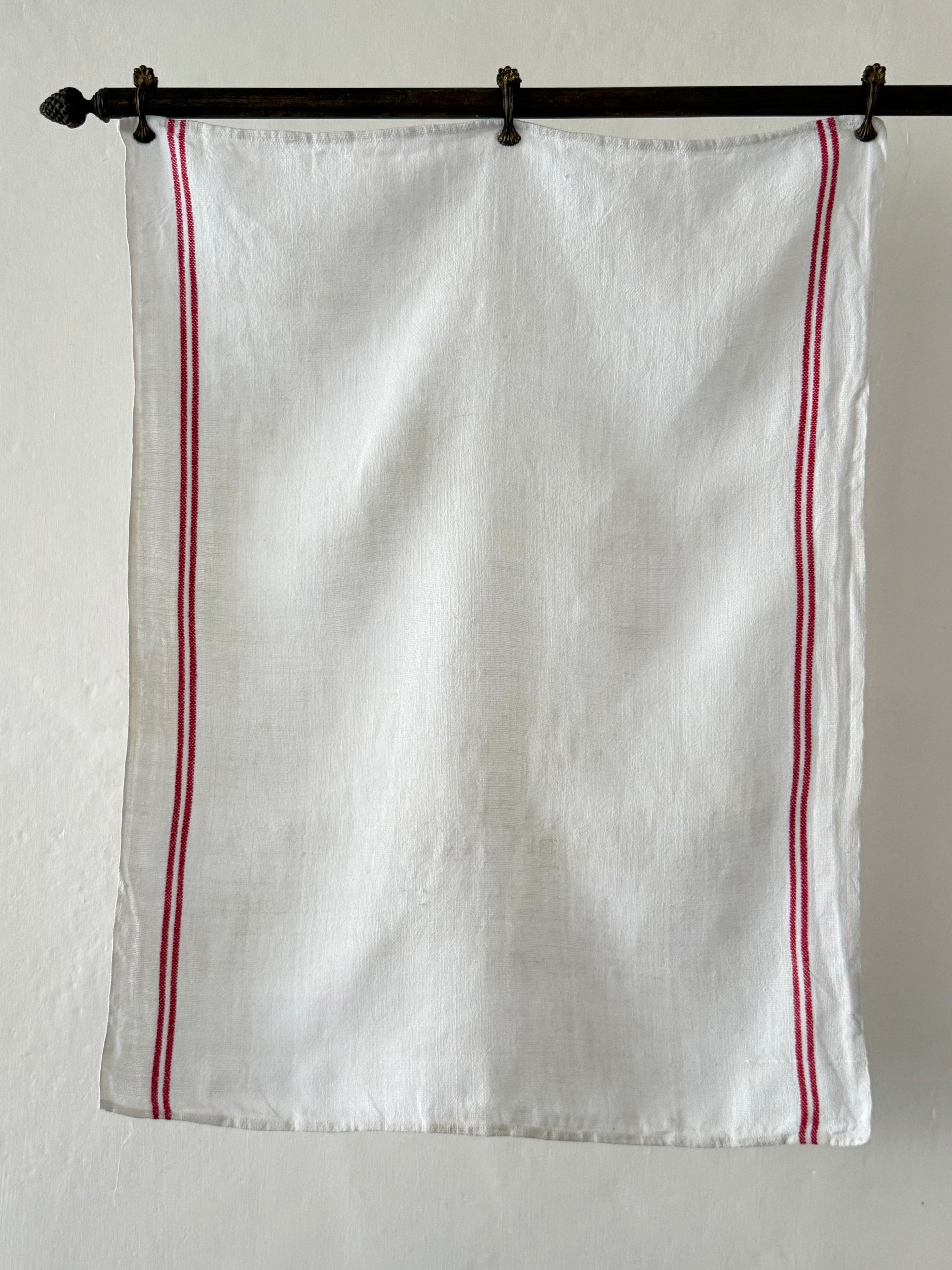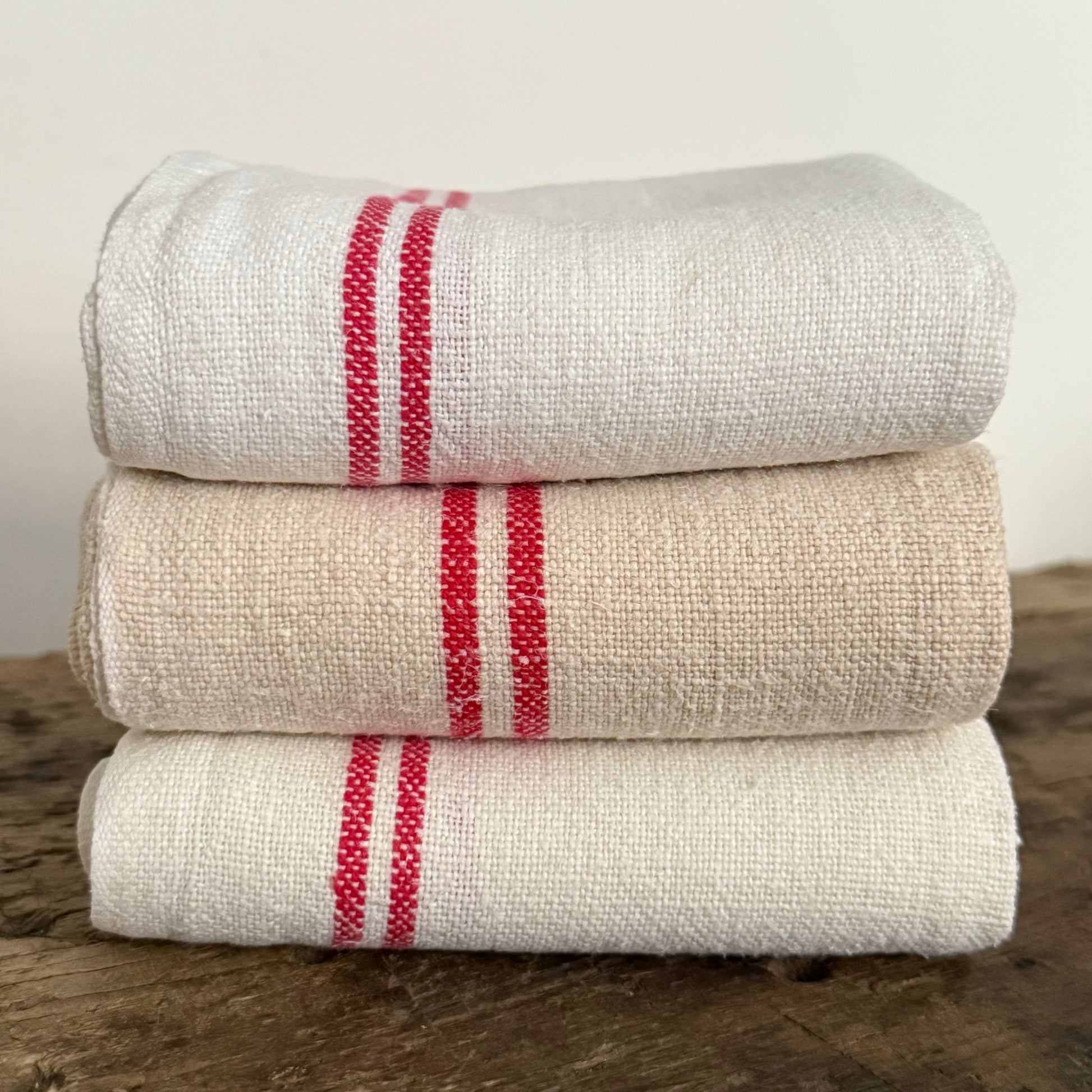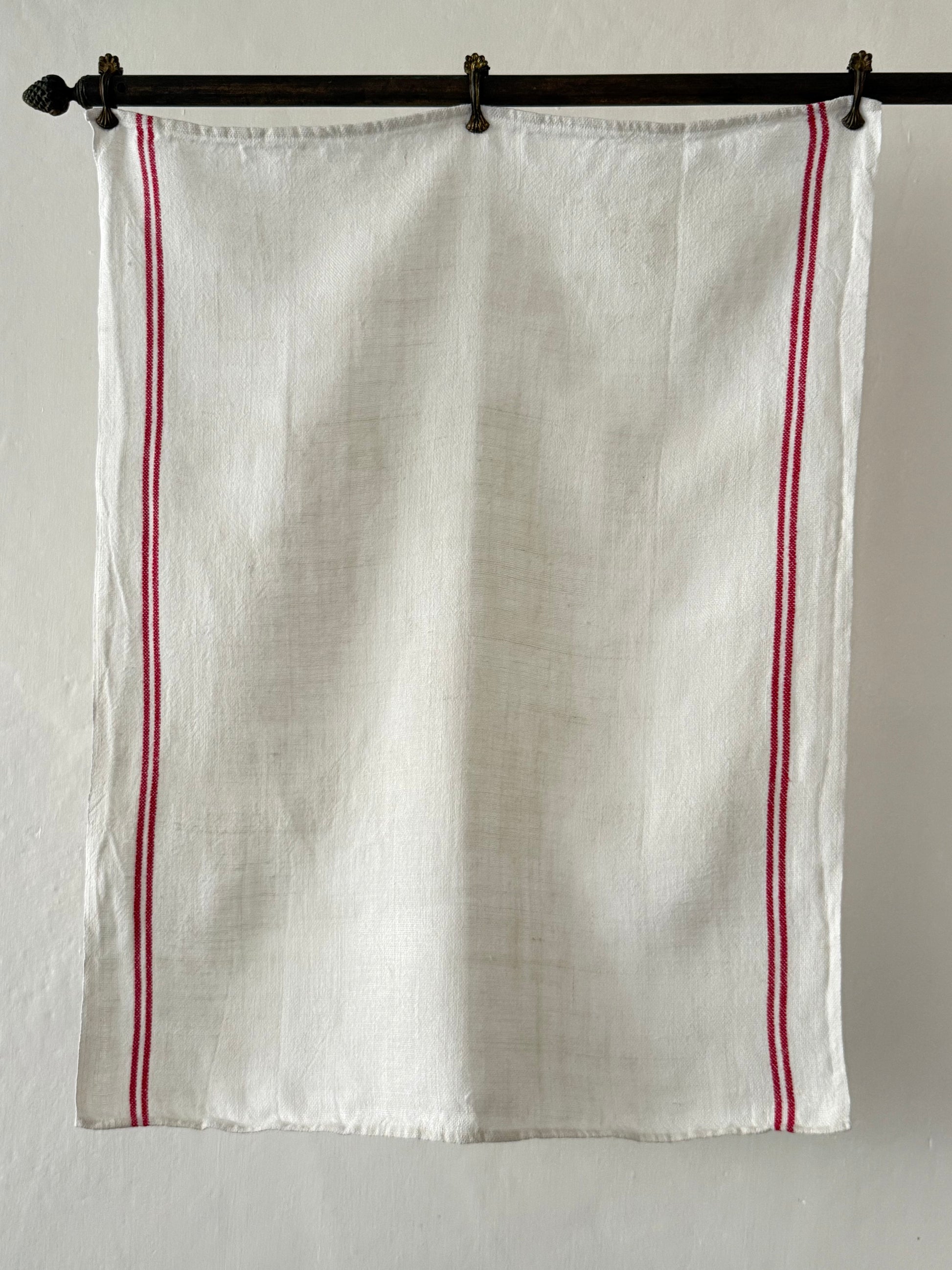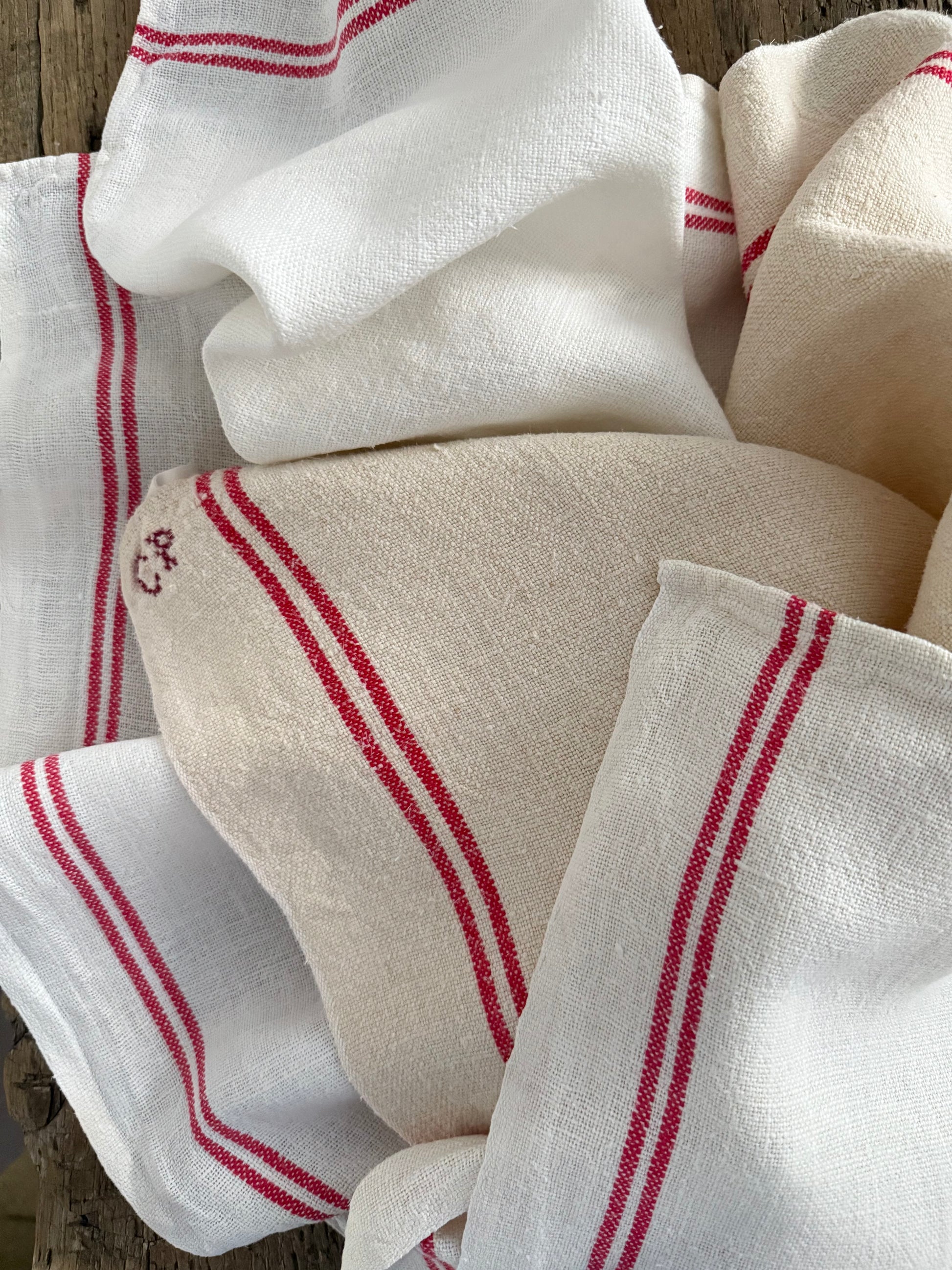 Set of 3 French vintage hemp torchons, two raspberry red stripes down each side, a CP monogram and loop to hang on the one with the natural hue. This is a different colour because it has never been used!