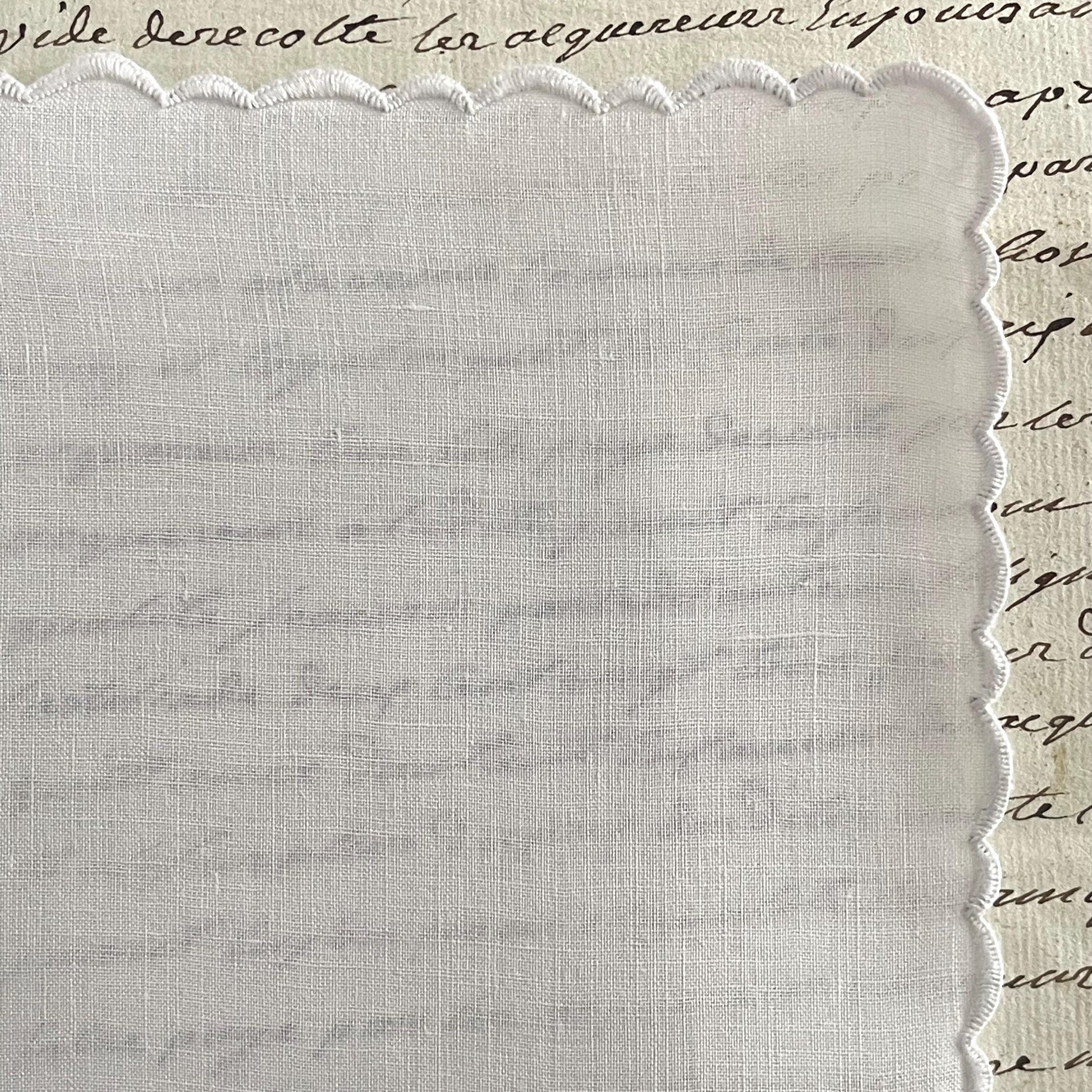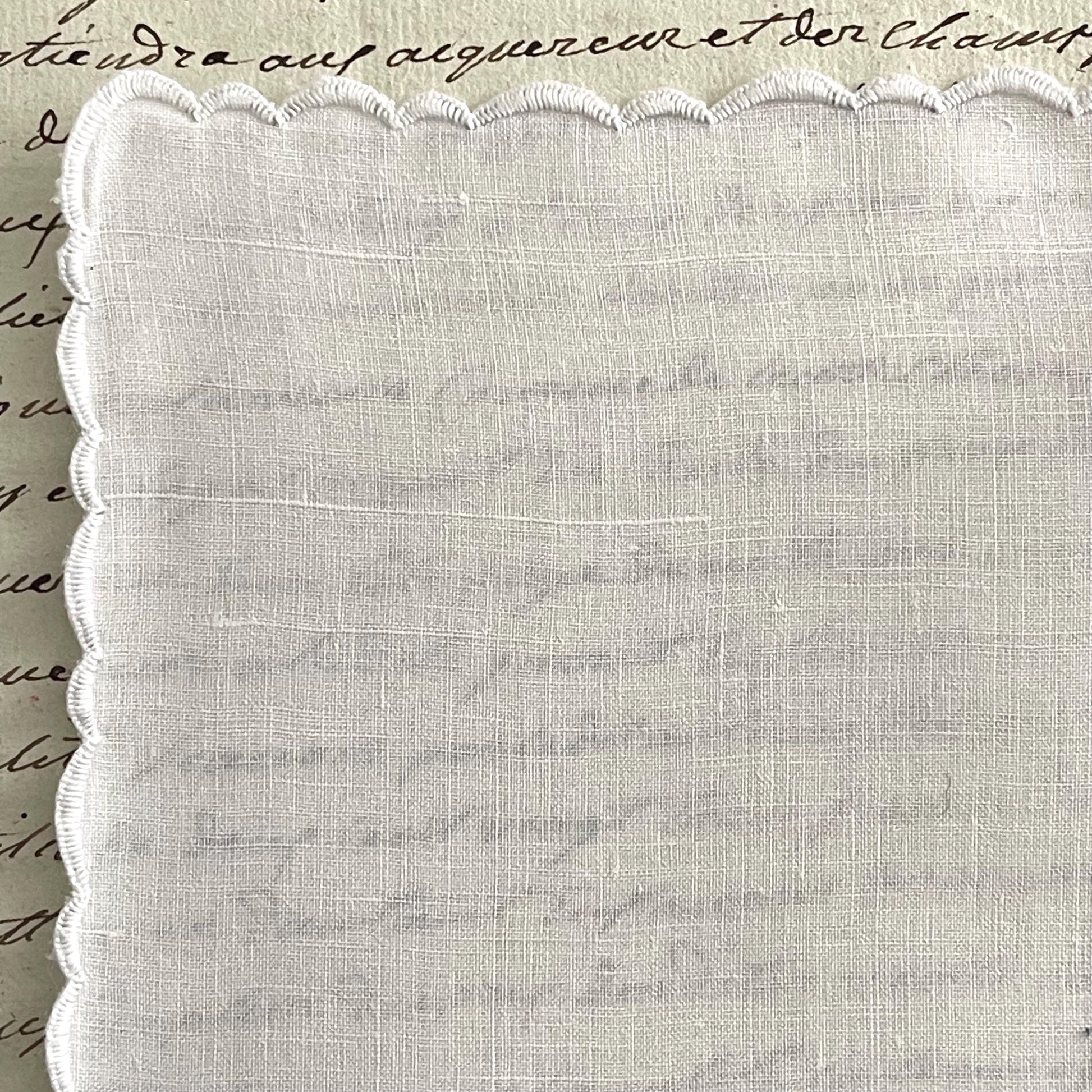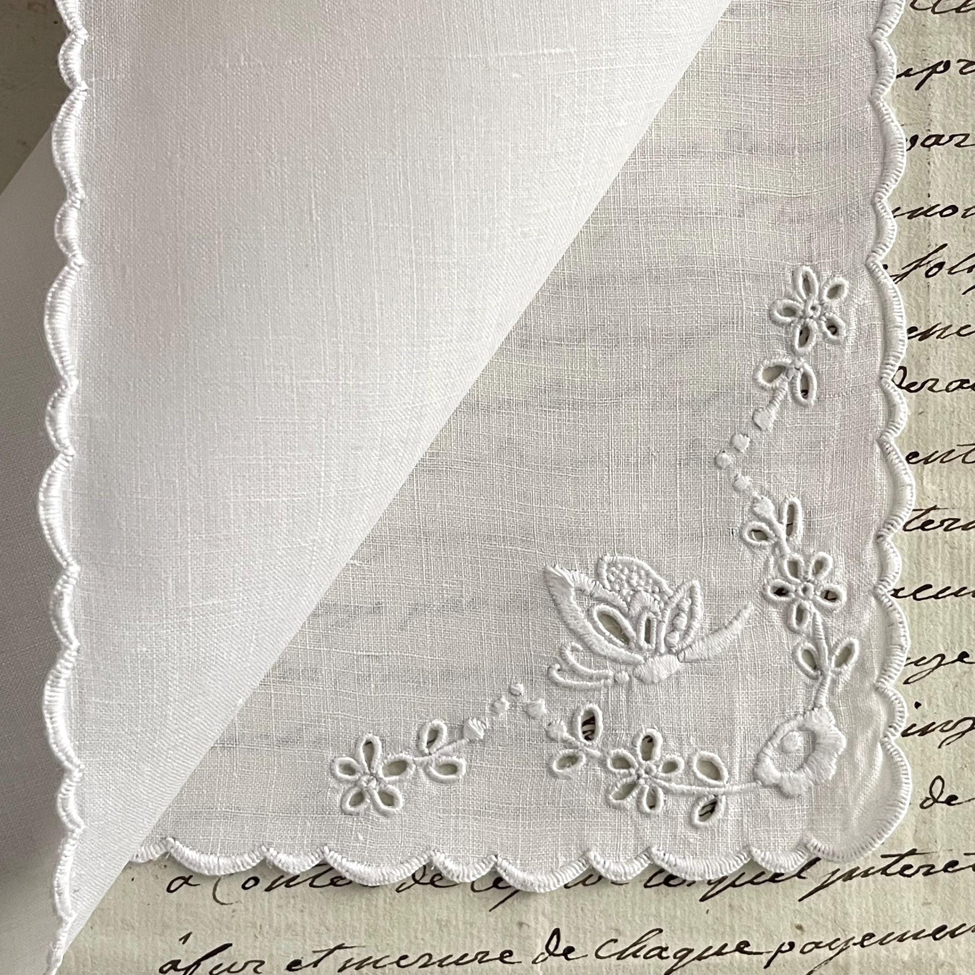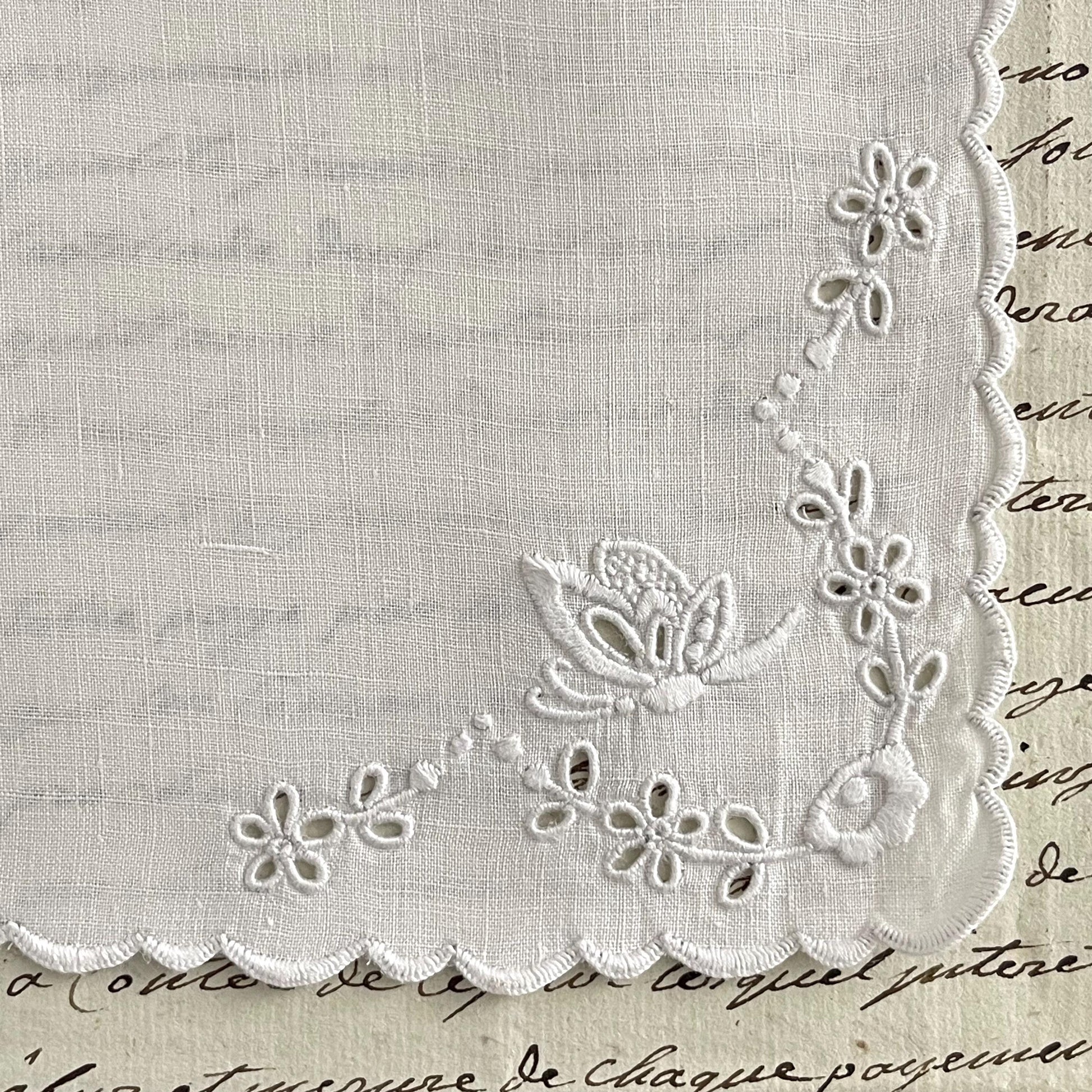 Pretty French antique handmade bridal handkerchief, scalloped edging and floral and butterfly detail on the corner.