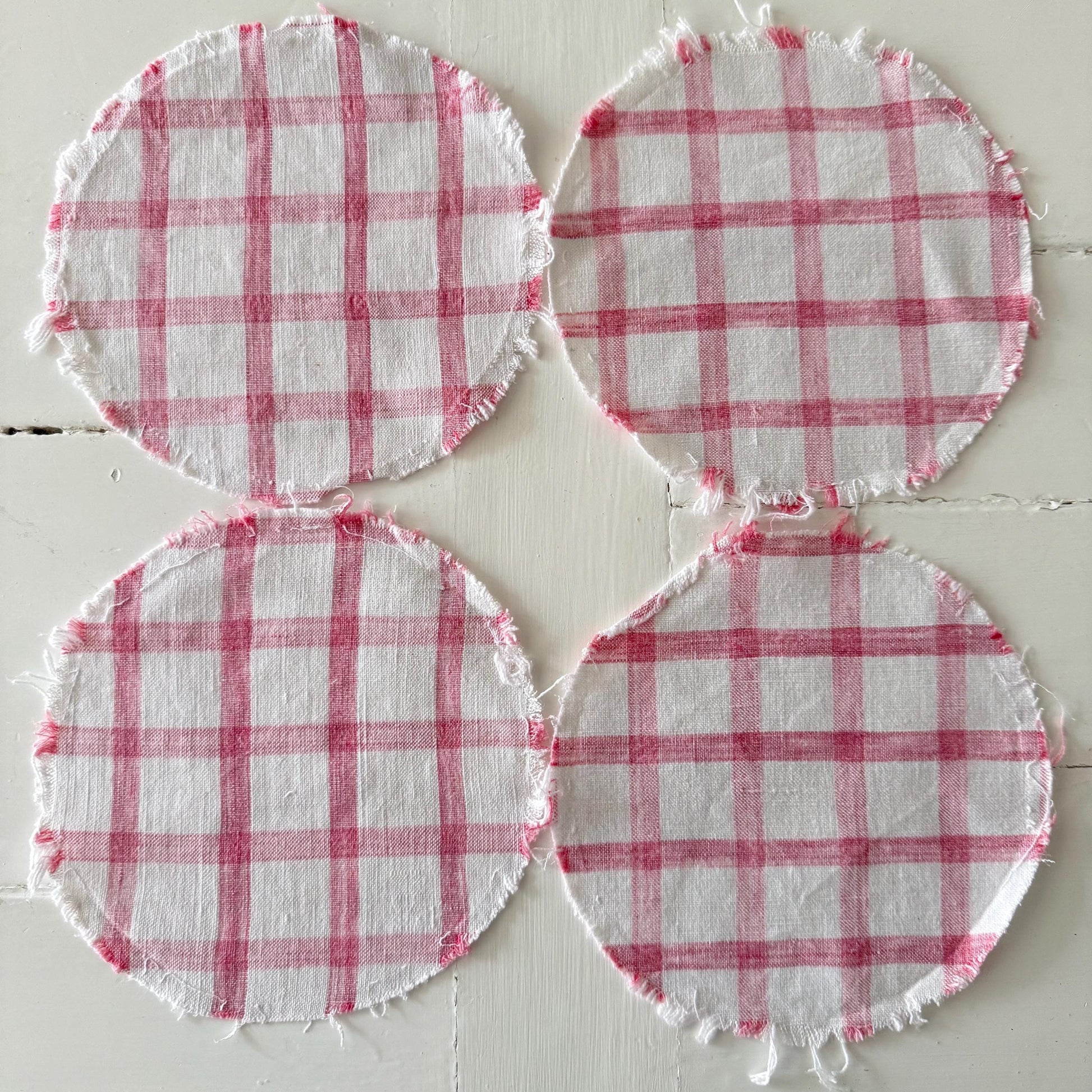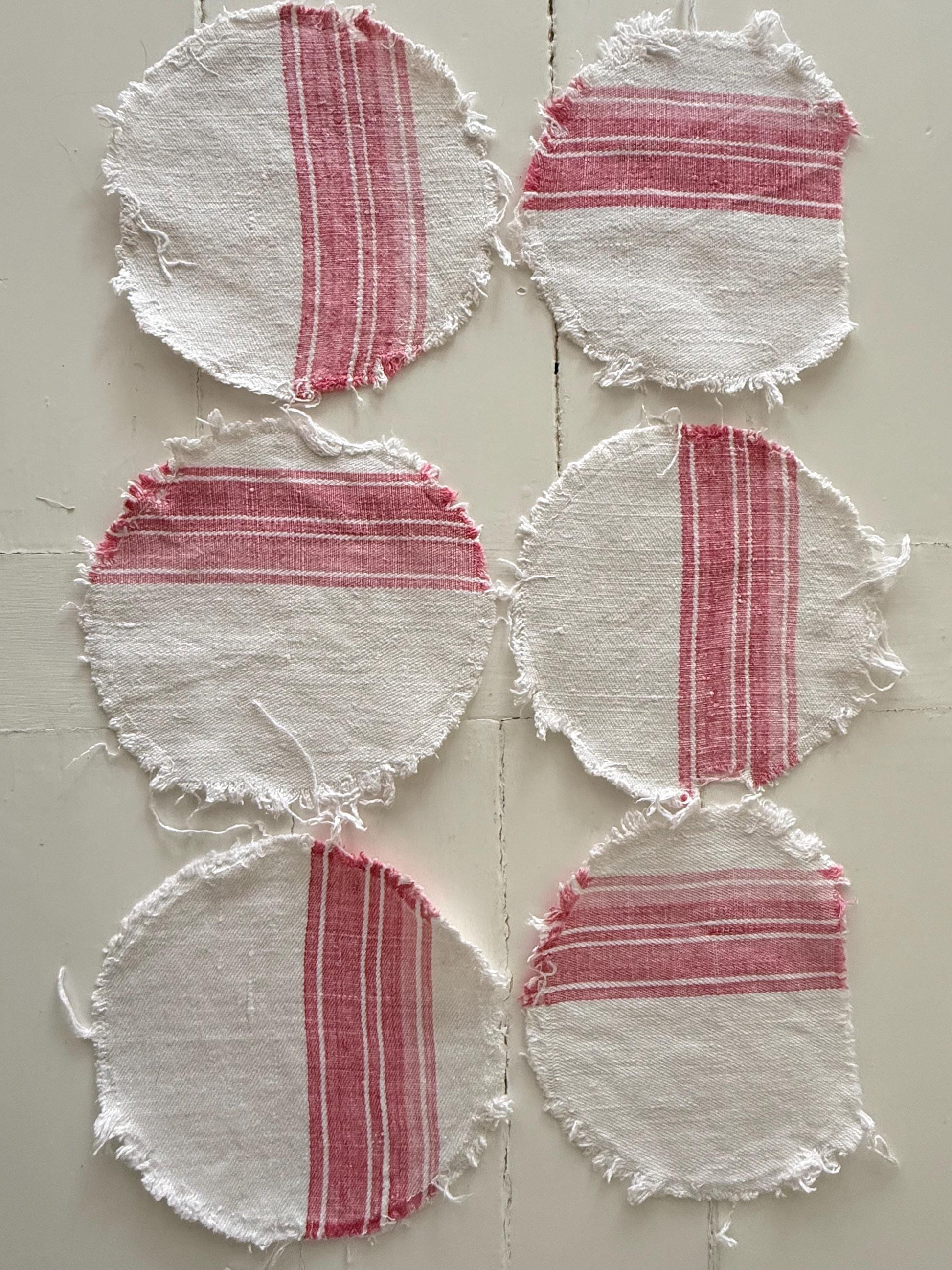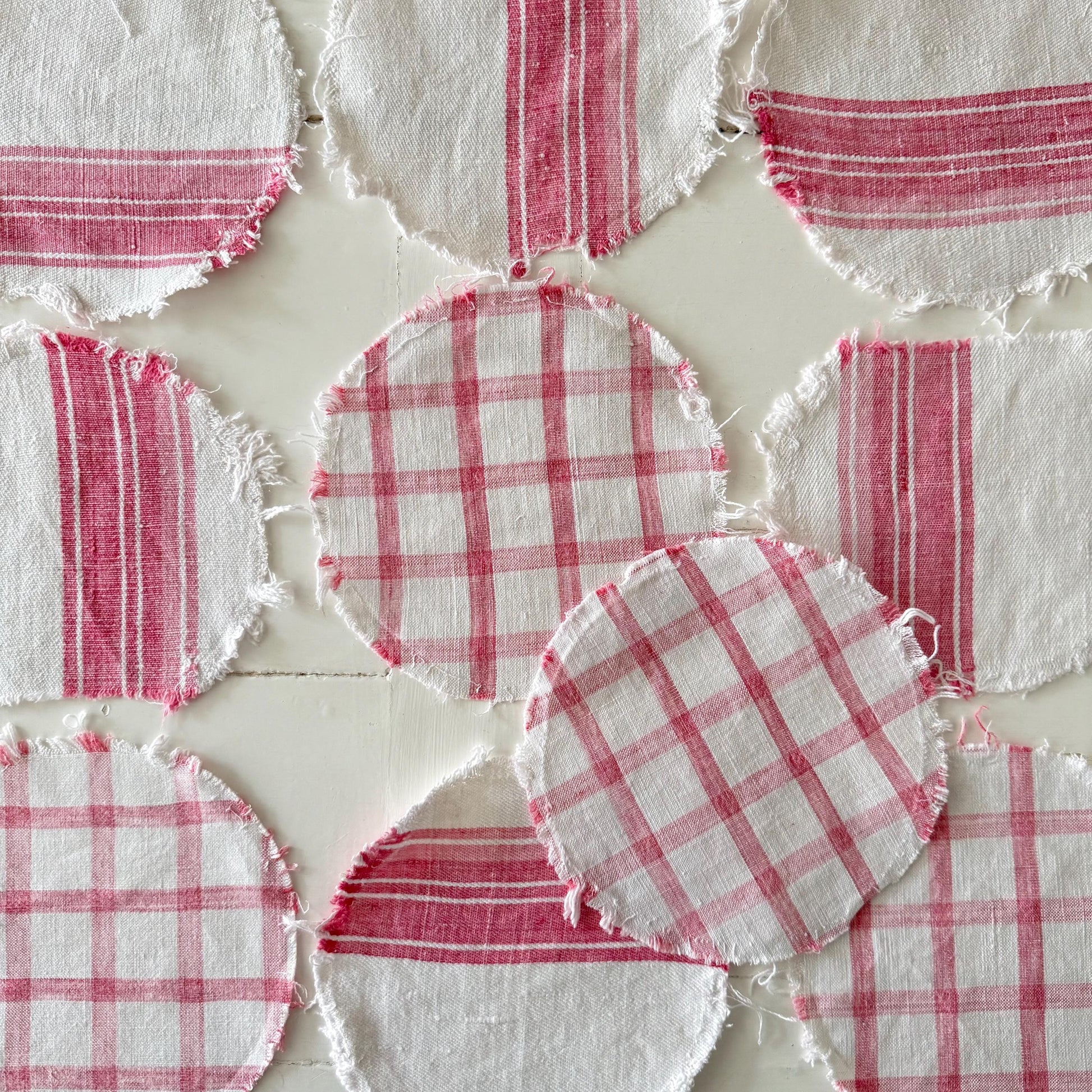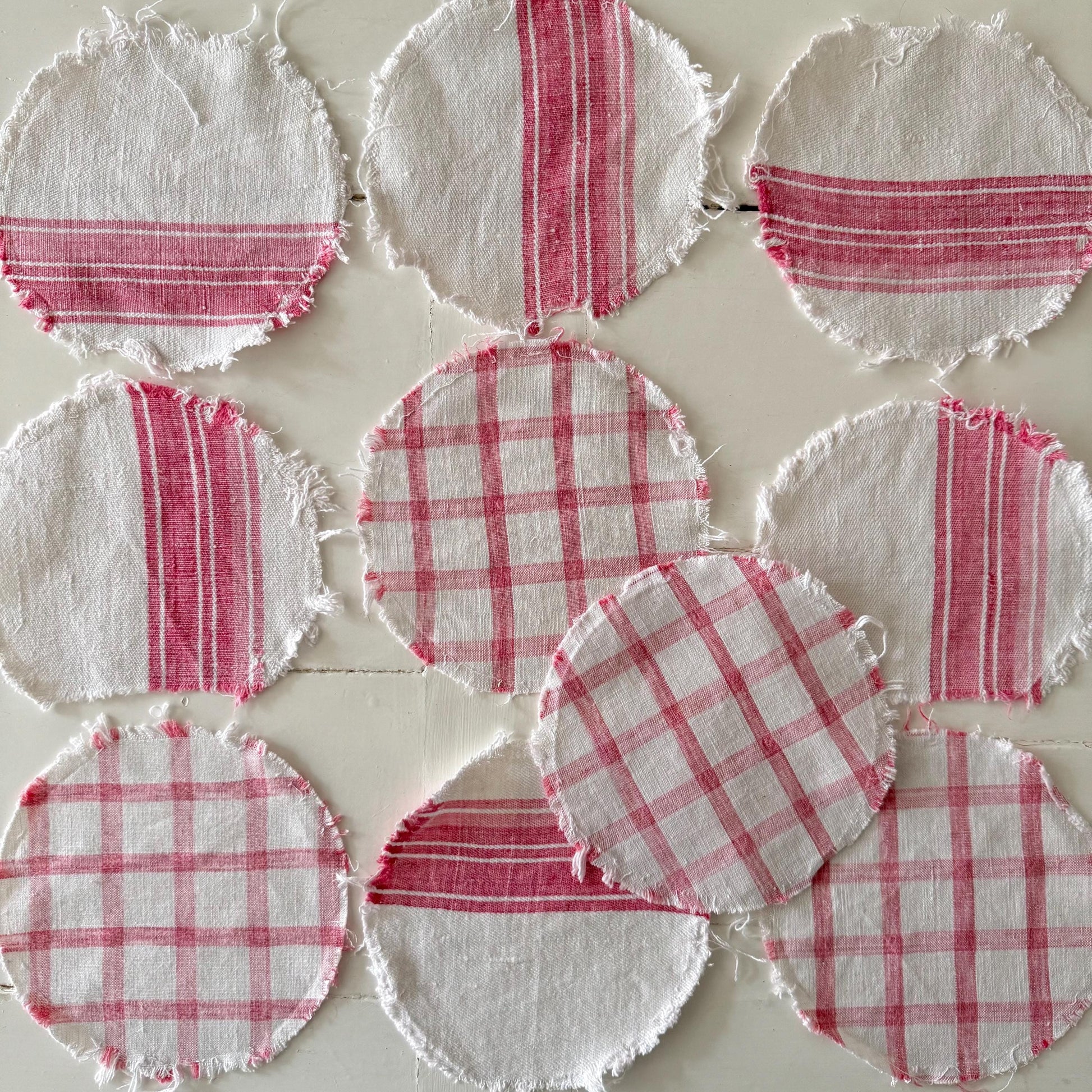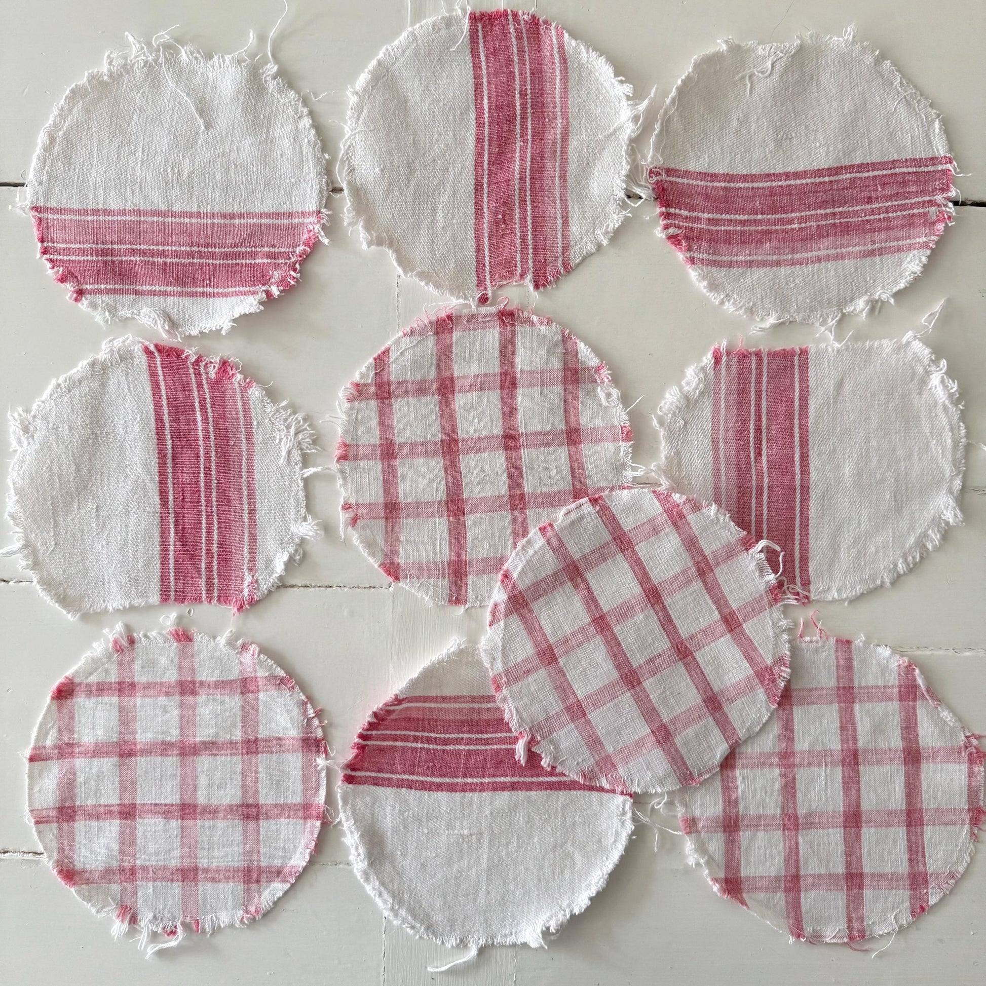 10 Circles of French antique raspberry and white striped & checkered linen…. softly faded.