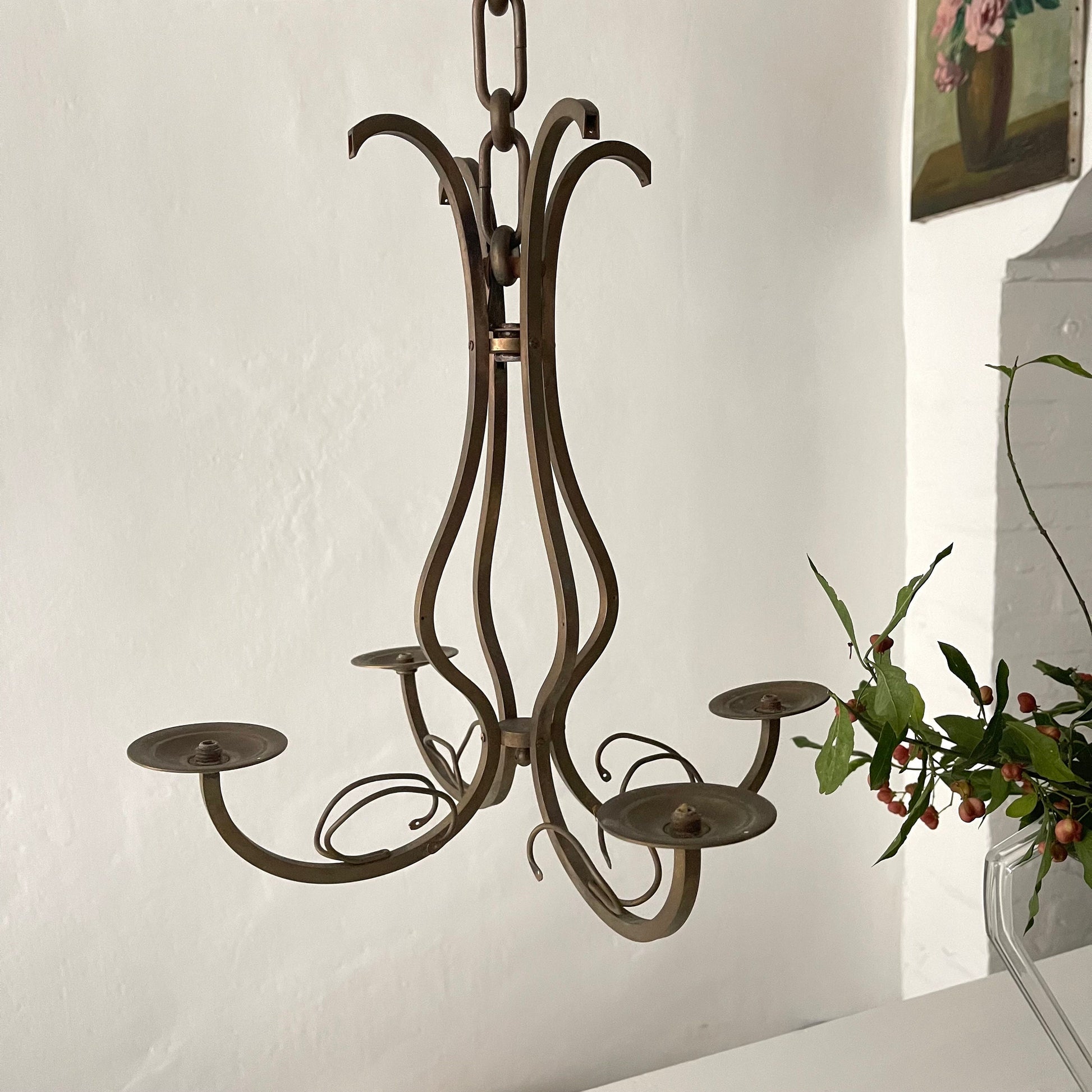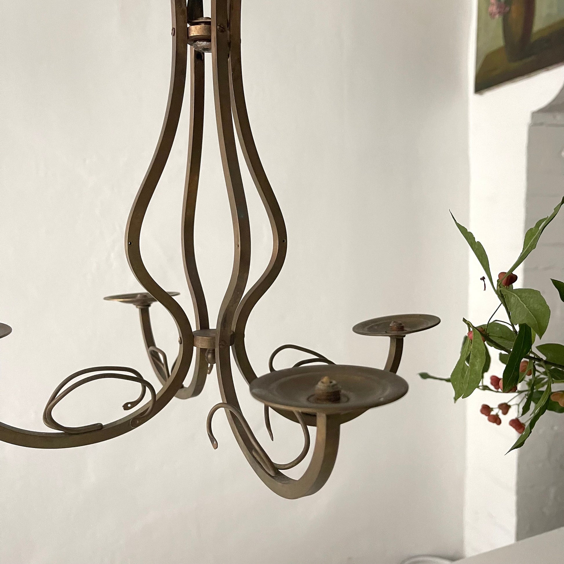 Pretty 4 branch vintage 'bare bones' brass Château chandelier. This stripped down beauty is ready for you to add your own style. Whether you just add candles, or rewire it, or just you could just wrap it in fairy lights and ivy and hang it from a tree in the garden!!