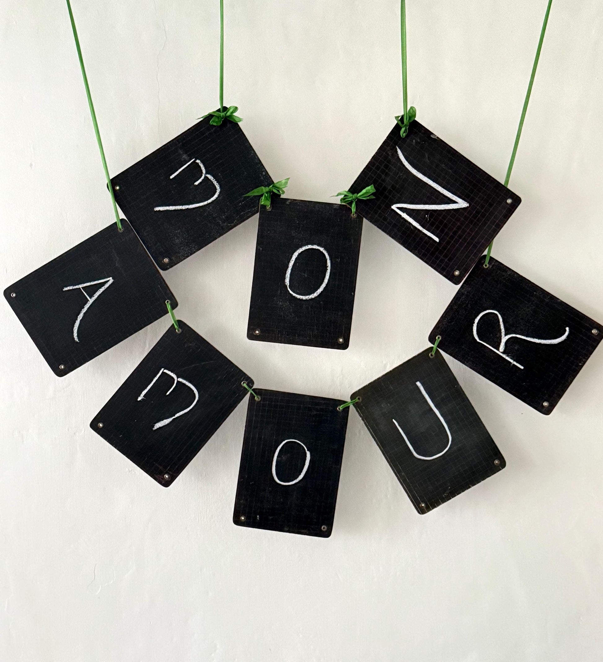 An œillet in each corner making them ideal to thread onto a ribbon and used daily to write a shopping list on, or a greeting. Hang on the wall or in the garden for a party / wedding celebration… could be used landscape or portrait.