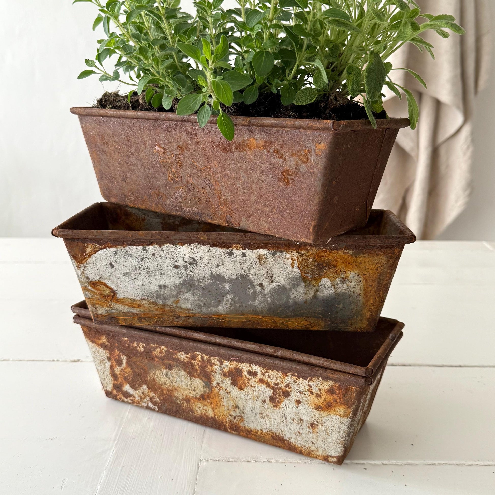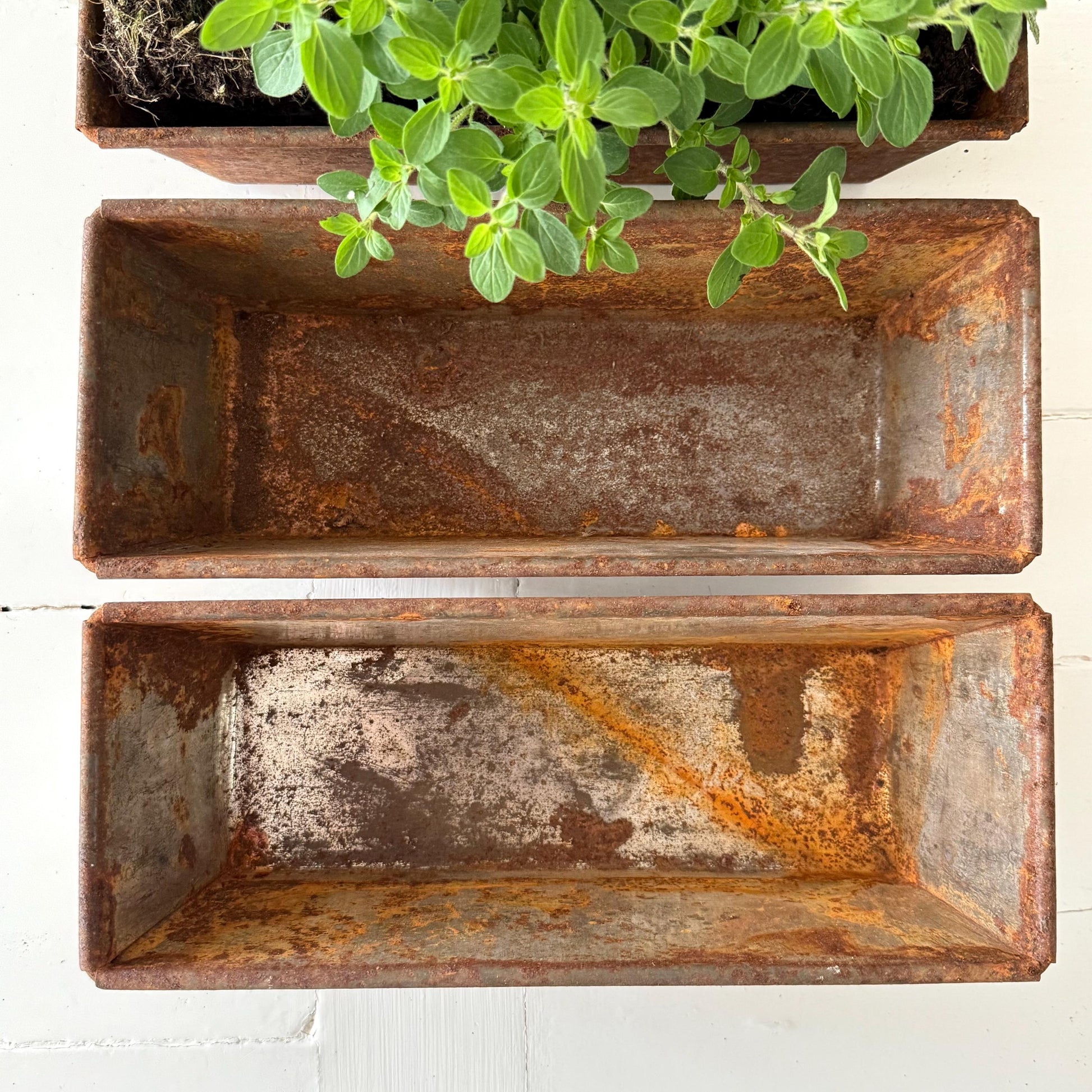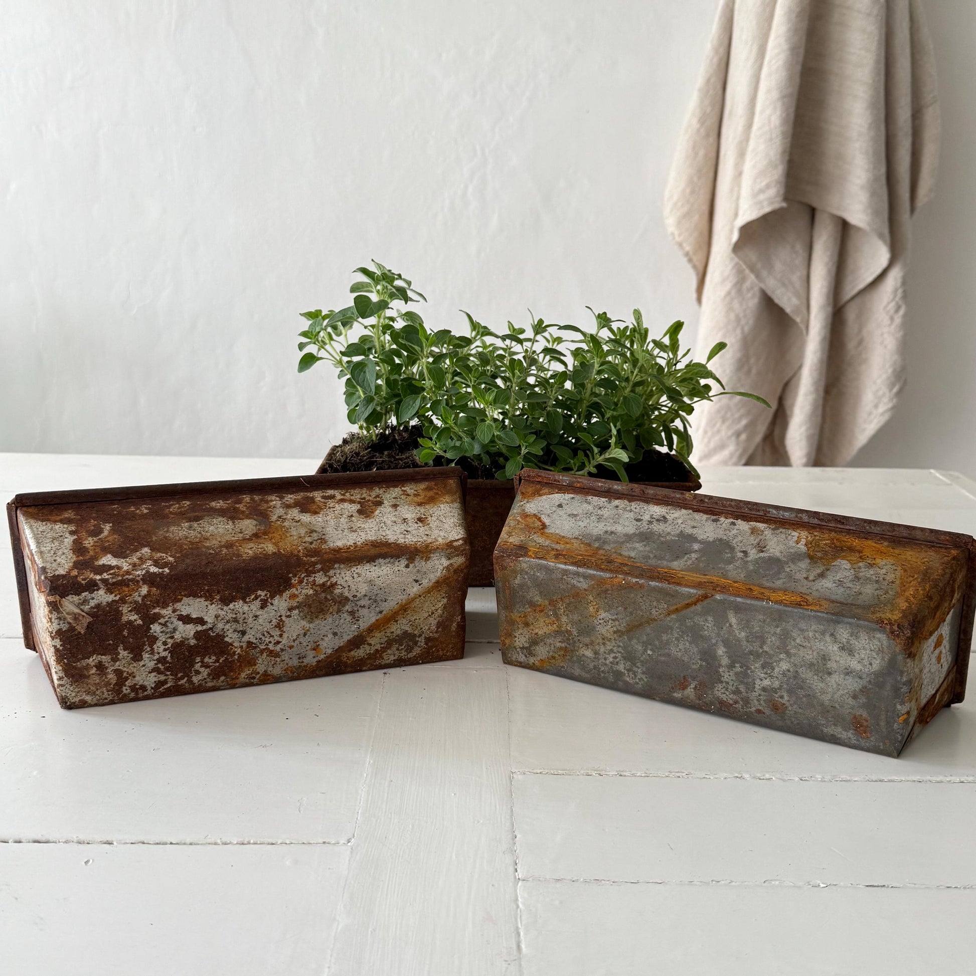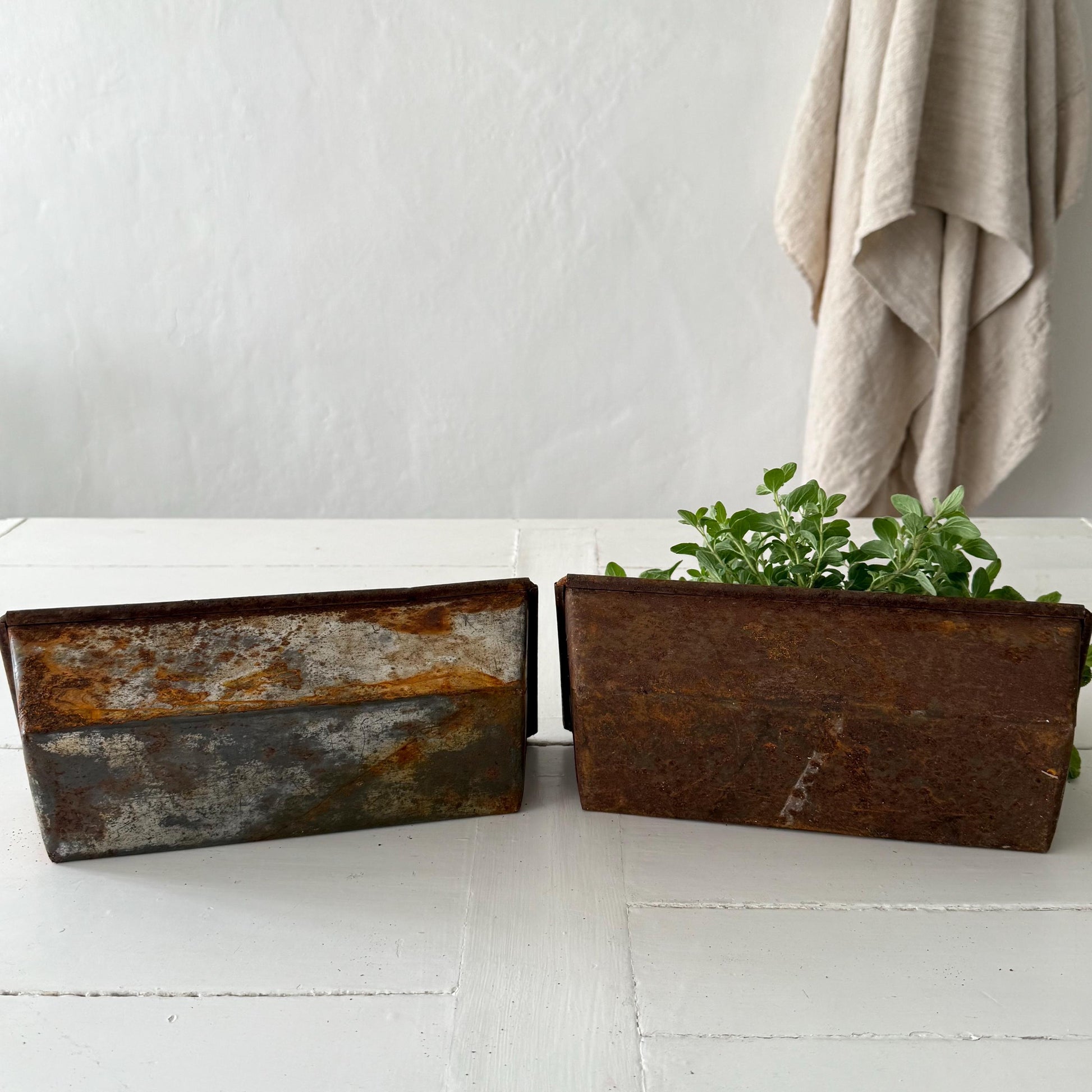 Pair of French vintage rusty loaf tin planters...weighty and very solid....the patina is wonderful.