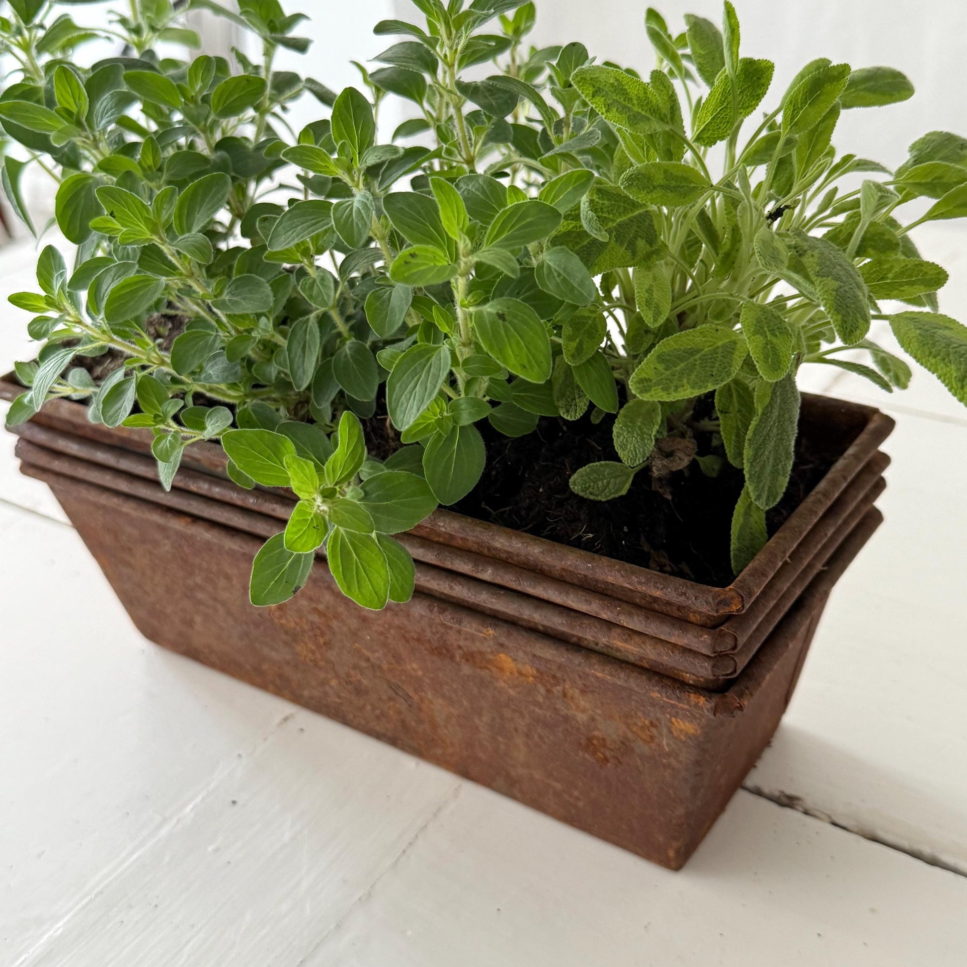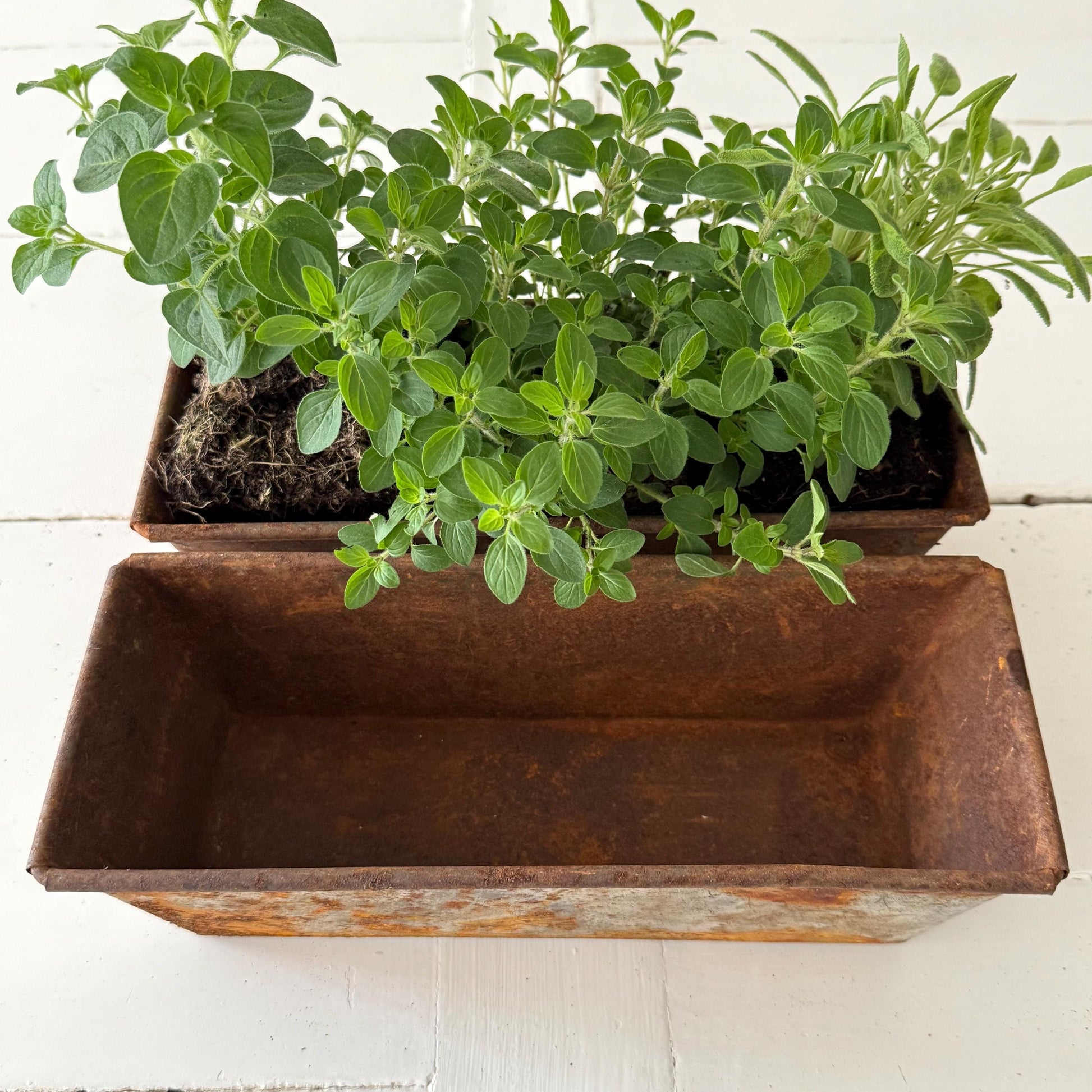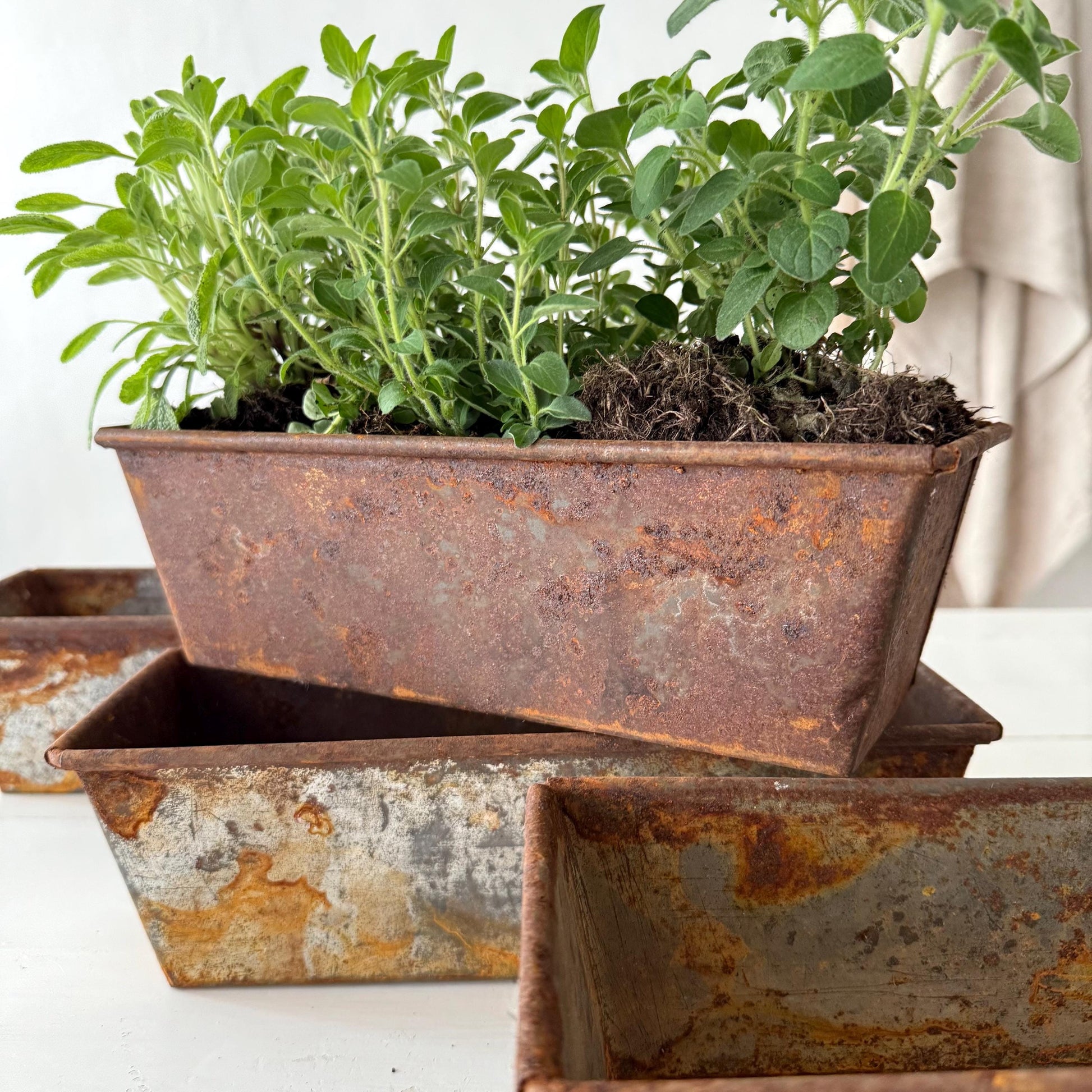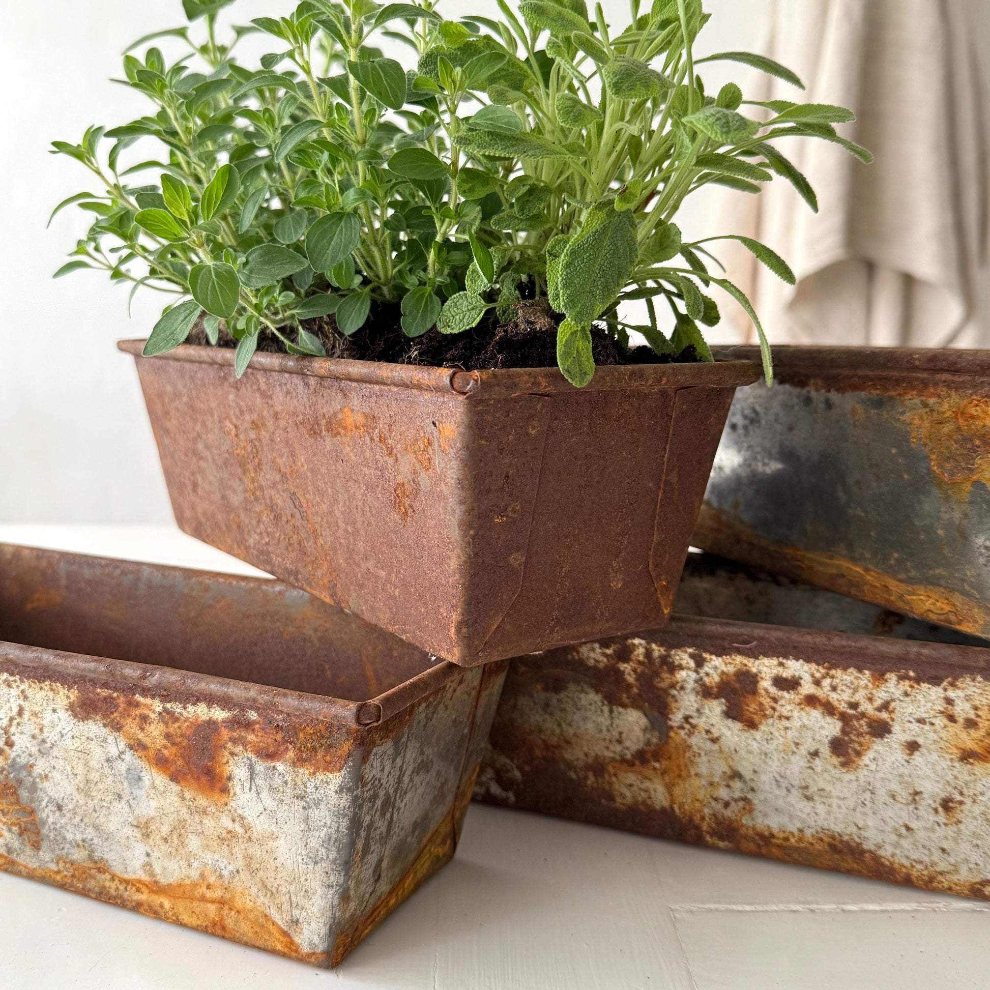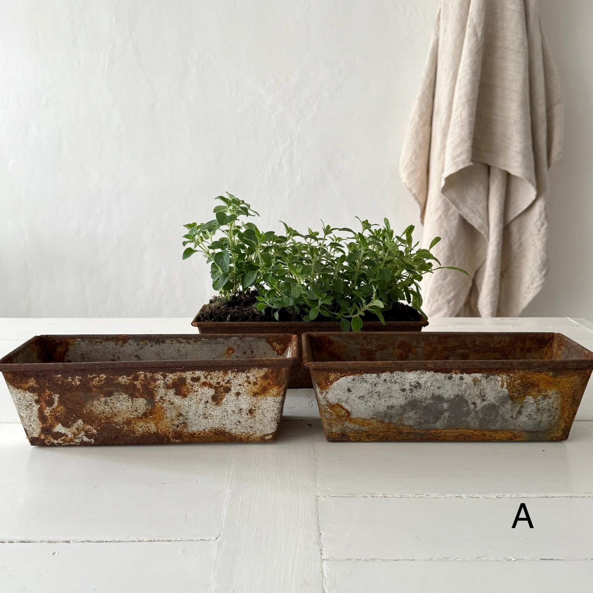 Pair of French vintage rusty loaf tin planters...weighty and very solid....the patina is wonderful.