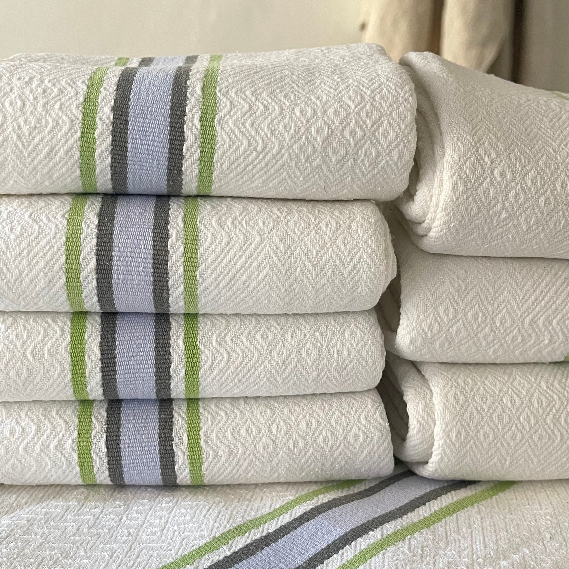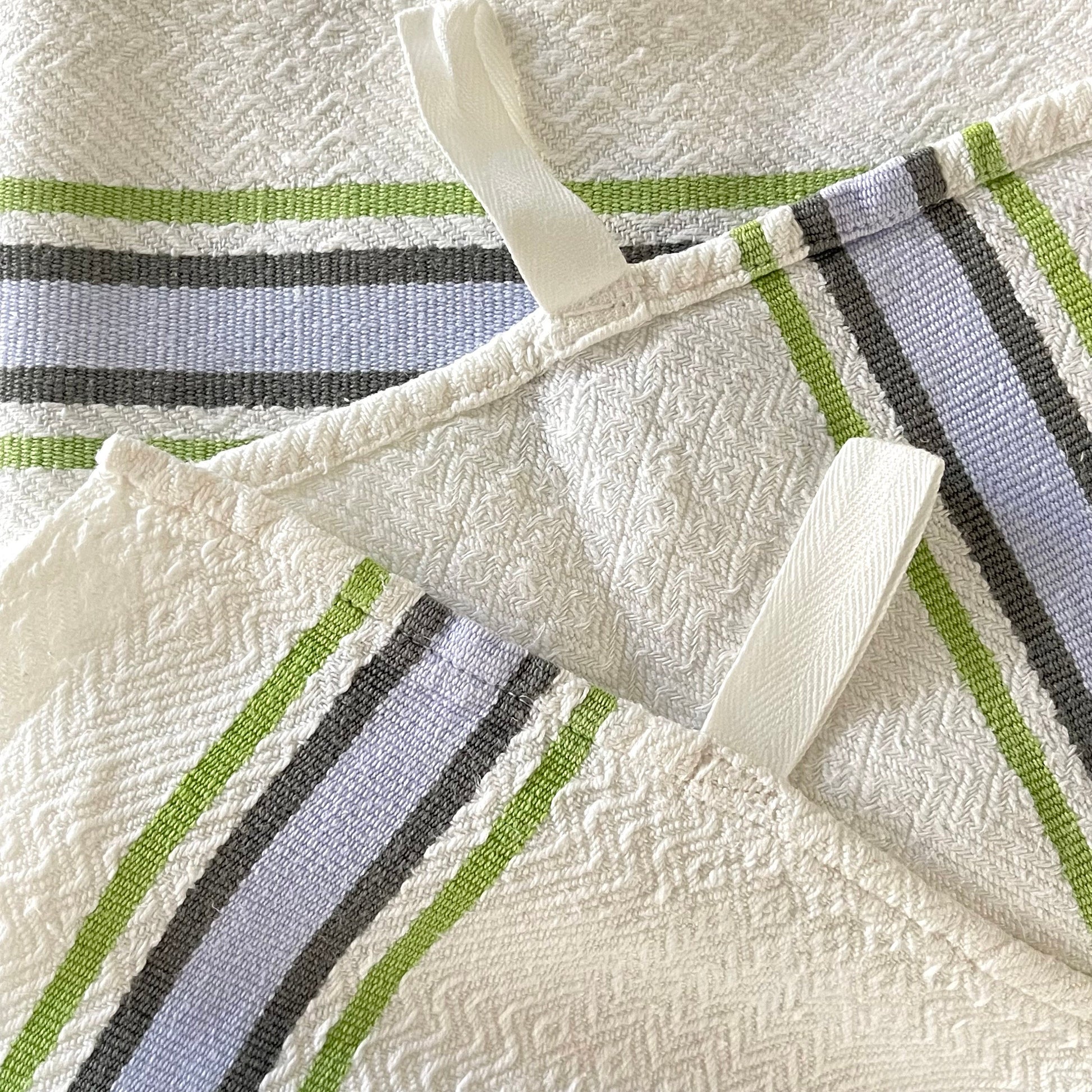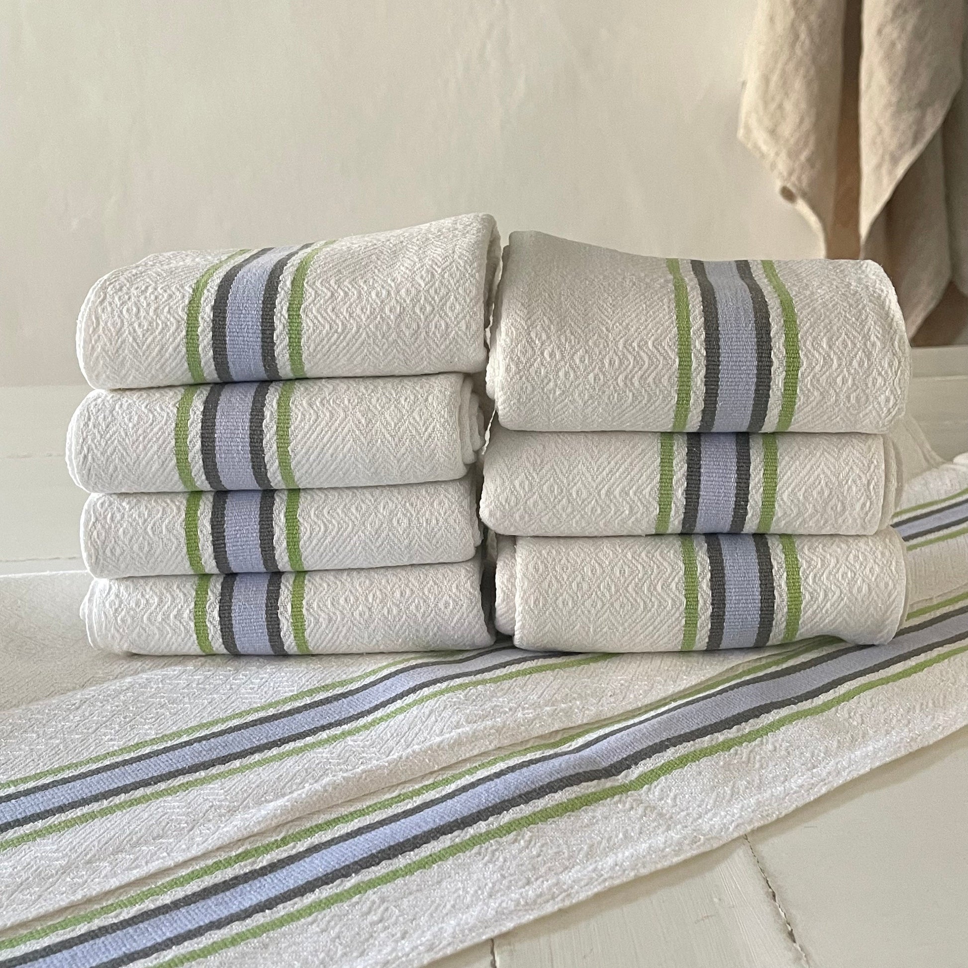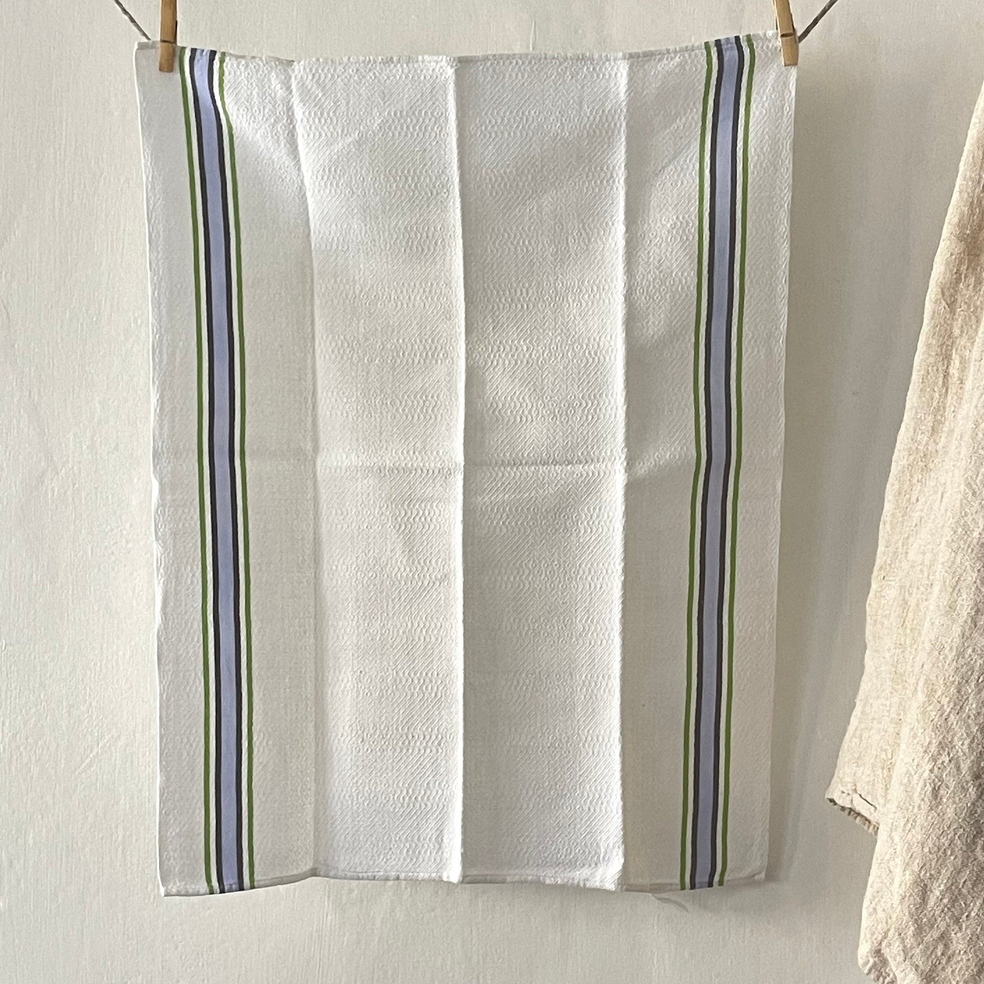 Pair French vintage blue and green linen / cotton stripey torchons, 2 loops to hang, one on each end…substantial, fine quality.