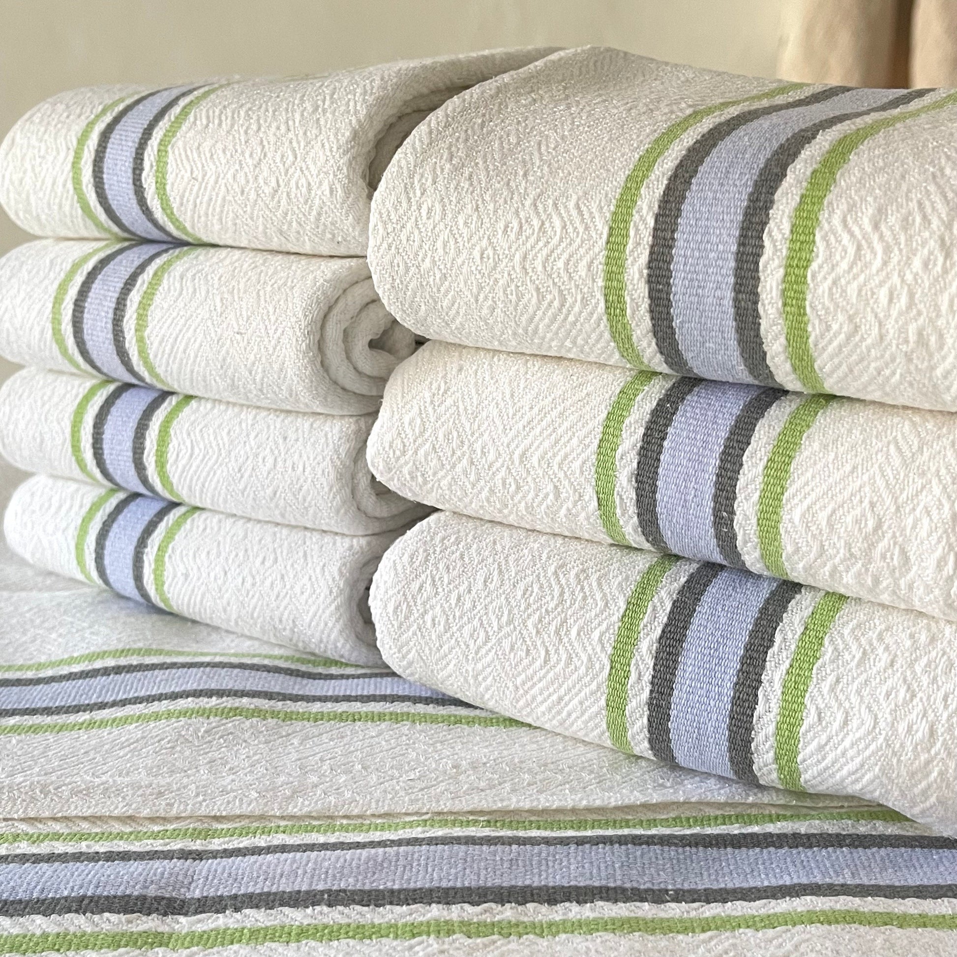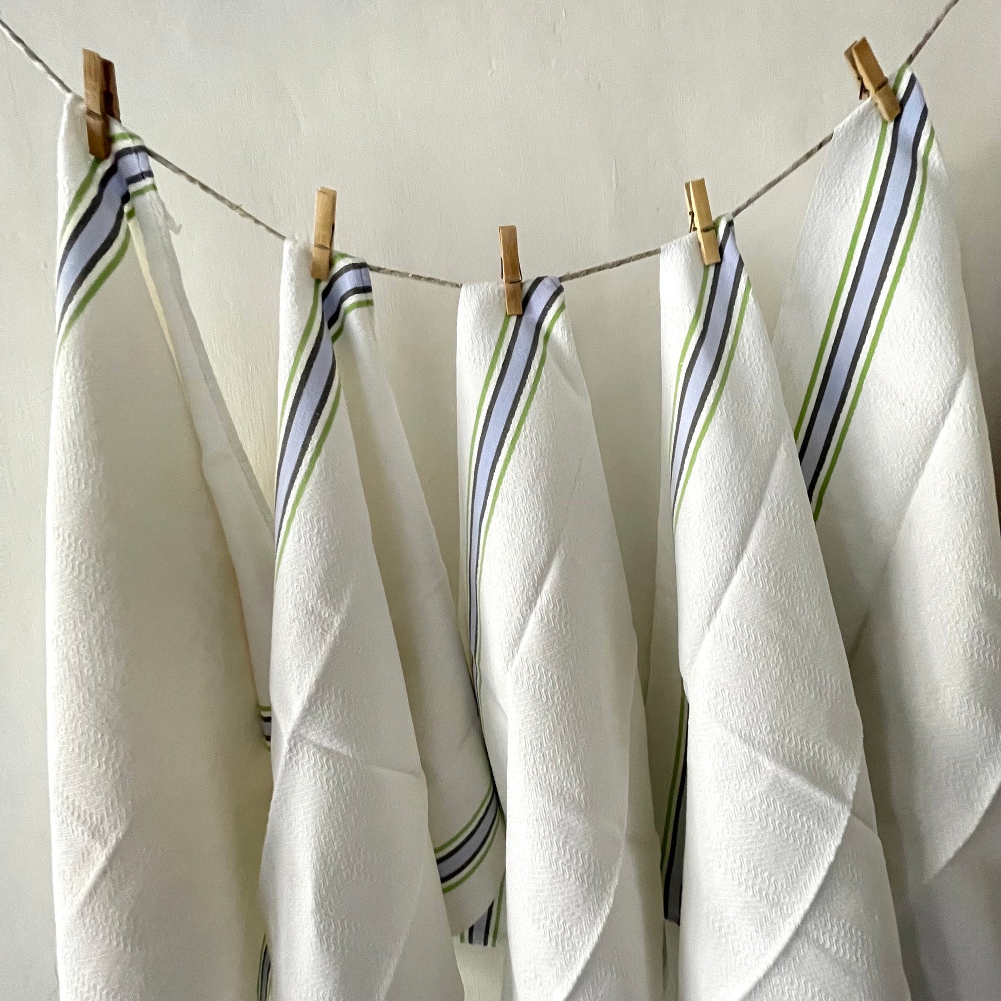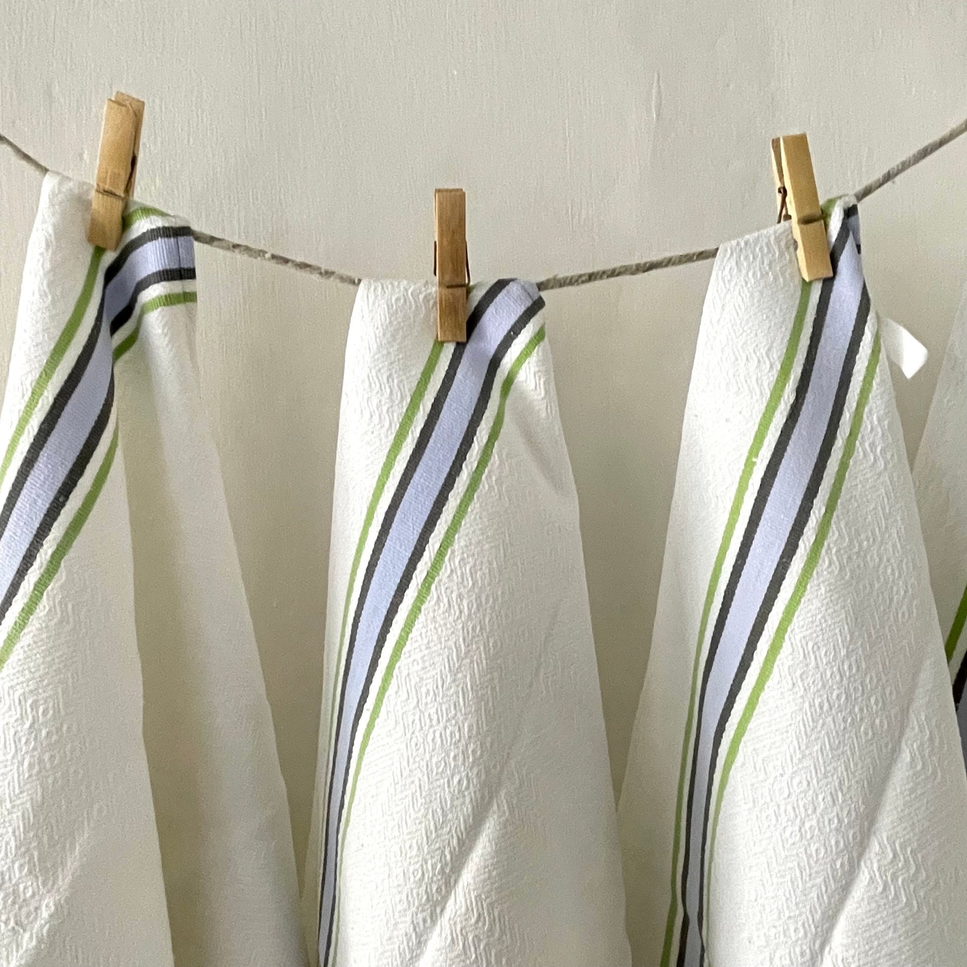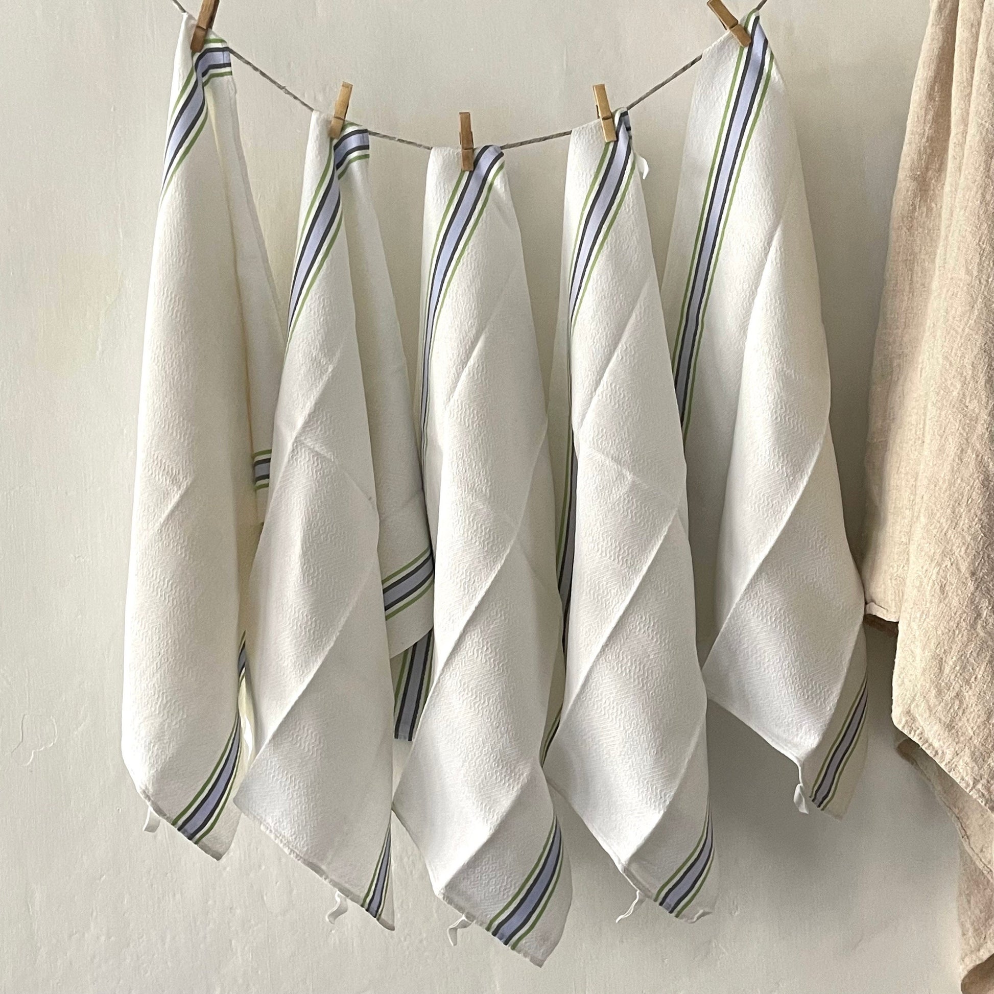 Pair French vintage blue and green linen / cotton stripey torchons, 2 loops to hang, one on each end…substantial, fine quality.
